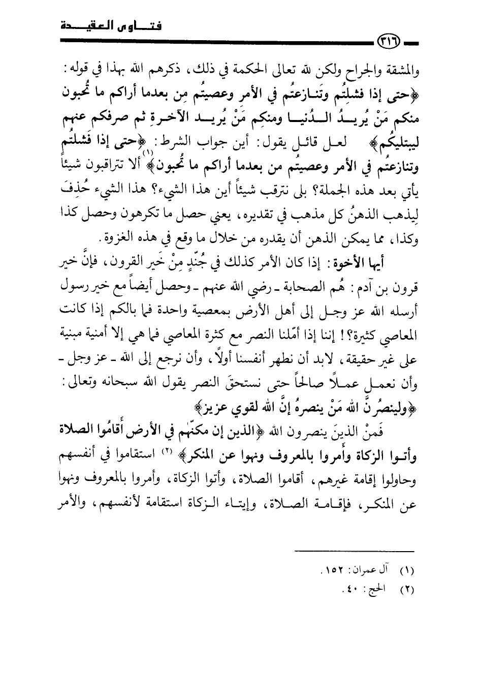 فمن الذين ينصرون الله {الَّذِينَ إِنْ مَكَّنَّاهُمْ فِي الْأَرْضِ أَقَامُوا الصَّلَاةَ وَآتَوُا الزَّكَاةَ وَأَمَرُوا بِالْمَعْرُوفِ وَنَهَوْا عَنِ الْمُنْكَرِ} استقاموا في أنفسهم وحاولوا إقامة غيرهم، أقاموا الصلاة وآتوا الزكاة، وأمروا بالمعروف ونهوا عن المنكر، فإقامة الصلاة، وإيتاء الزكاة استقامة لأنفسهم، والأمر