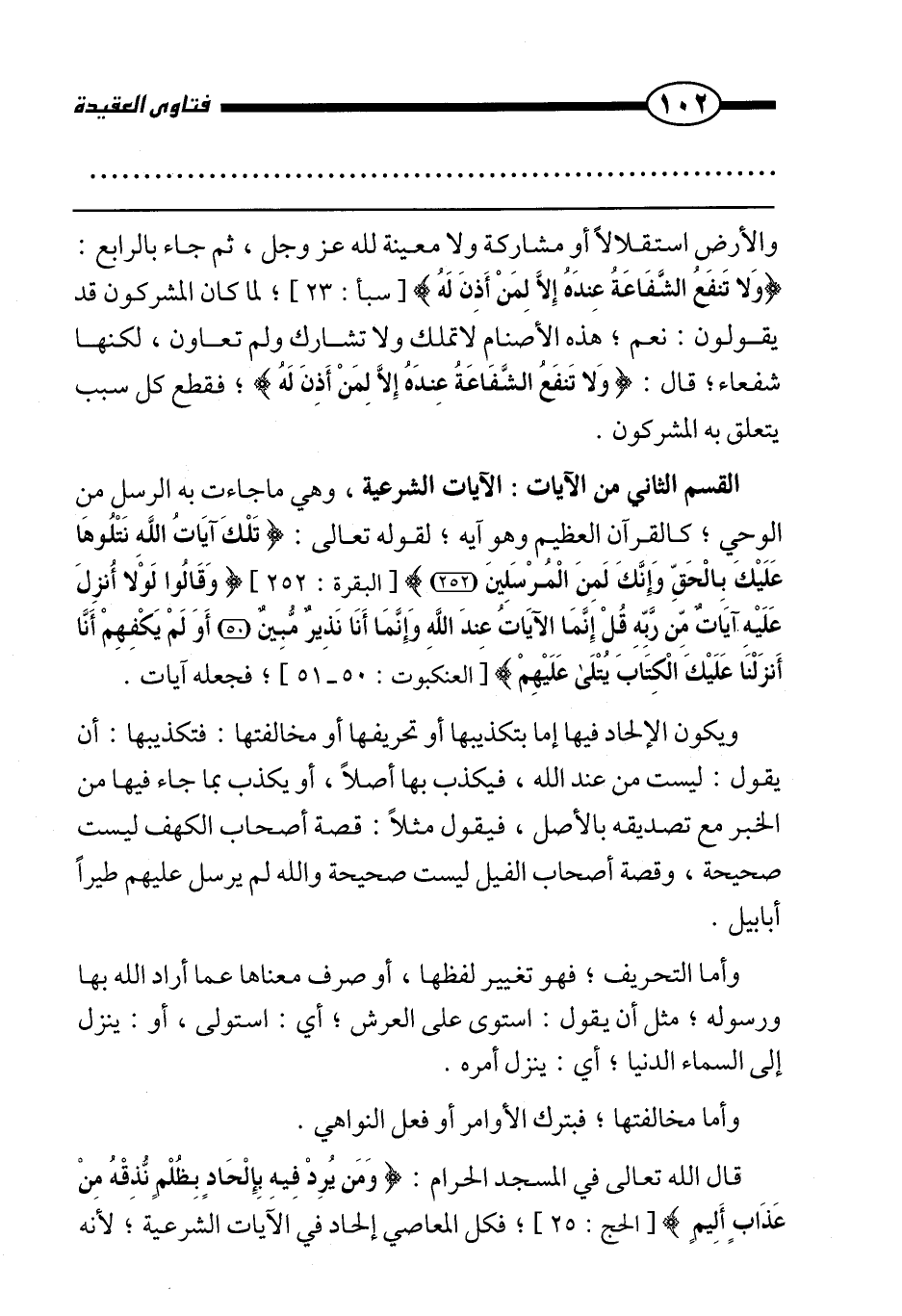 القسم الثاني من الآيات: الآيات الشرعية، وهي ما جاءت به الرسل من الوحي، كالقرآن العظيم وهو آية، لقوله تعالى: {تِلْكَ آيَاتُ اللَّهِ نَتْلُوهَا عَلَيْكَ بِالْحَقِّ وَإِنَّكَ لَمِنَ الْمُرْسَلِينَ} [البقرة: 252] {وَقَالُوا لَوْلَا أُنْزِلَ عَلَيْهِ آيَاتٌ مِنْ رَبِّهِ قُلْ إِنَّمَا الْآيَاتُ عِنْدَ اللَّهِ وَإِنَّمَا أَنَا نَذِيرٌ مُبِينٌ أَوَلَمْ يَكْفِهِمْ أَنَّا أَنْزَلْنَا عَلَيْكَ الْكِتَابَ يُتْلَى عَلَيْهِمْ} [العنكبوت: 50 - 51] ، فجعله آيات.