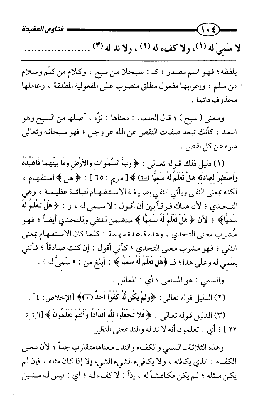 وهذه الثلاثة - السمي والكفء والند - معناها متقارب جدا، لأن معنى الكفء: الذي يكافئه، ولا يكافئ الشيء الشيء إلا إذا كان مثله، فإن لم يكن مثله، لم يكن مكافئًا، إذًا: لا كفء له، أي: ليس له مثيل