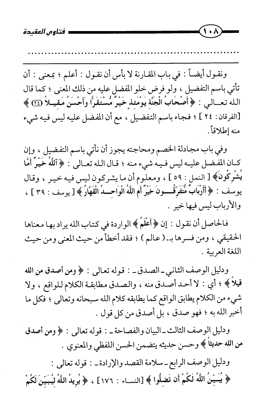 وفي باب مجادلة الخصم ومحاجته يجوز أن نأتي باسم التفضيل وإن كان المفضل عليه ليس فيه شيء منه، قال الله تعالى: {آللَّهُ خَيْرٌ أَمْ مَا يُشْرِكُونَ} [النمل: 59] ، ومعلوم أن ما يشركون ليس فيه خير، وقال يوسف: {أَأَرْبَابٌ مُتَفَرِّقُونَ خَيْرٌ أَمِ اللَّهُ الْوَاحِدُ الْقَهَّارُ} [يوسف: 39] ، والأرباب ليس فيها خير.