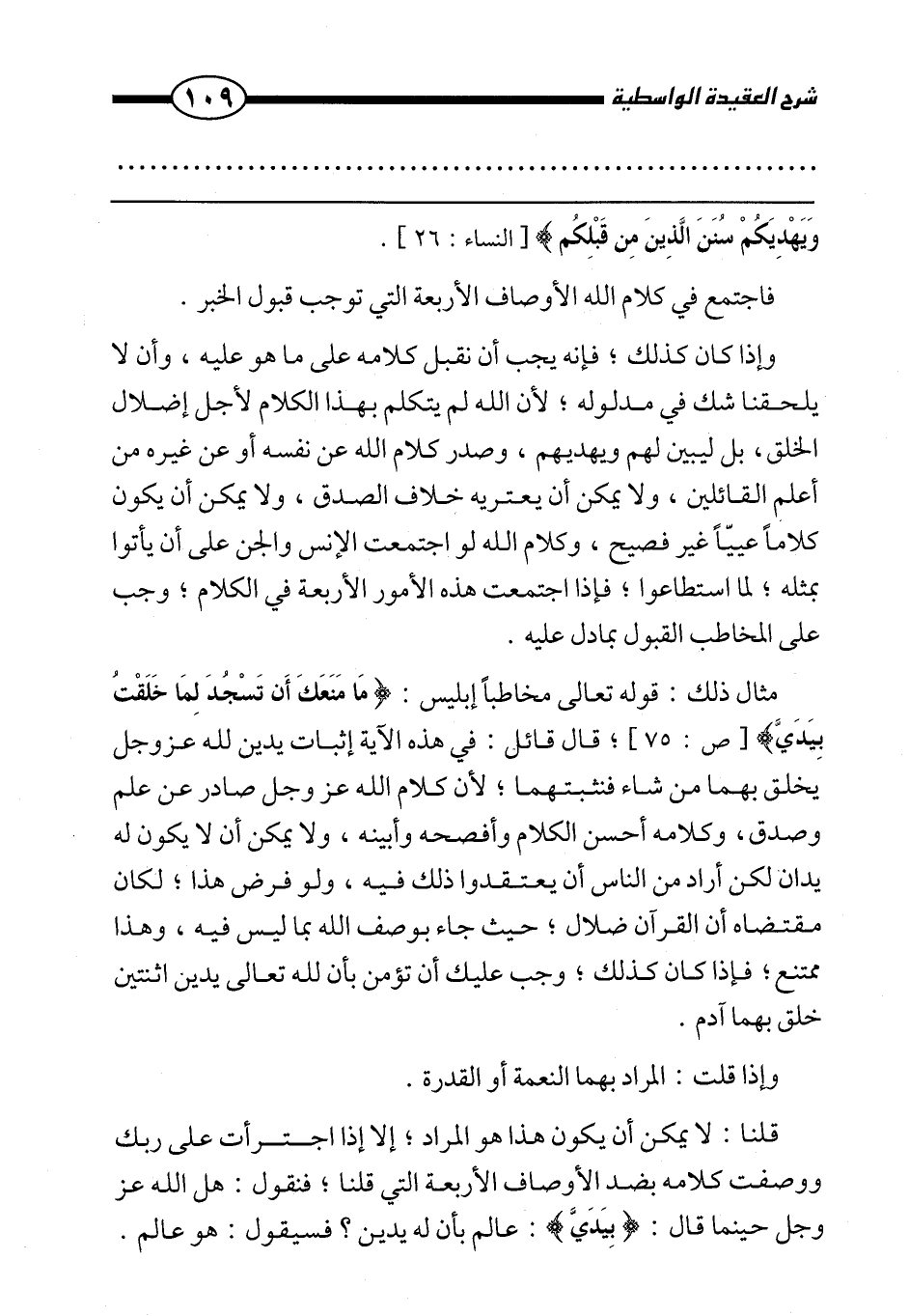 مثال ذلك: قوله تعالى مخاطبًا إبليس: {مَا مَنَعَكَ أَنْ تَسْجُدَ لِمَا خَلَقْتُ بِيَدَيَّ} [ص: 75] ، قال قائل: في هذه الآية إثبات يدين لله عز وجل يخلق بهما من شاء فنثبتهما، لأن كلام الله عز وجل صادر عن علم وصدق، وكلامه أحسن الكلام وأفصحه وأبينه، ولا يمكن أن لا يكون له يدان لكن أراد من الناس أن يعتقدوا ذلك فيه، ولو فرض هذا، لكان مقتضاه أن القرآن ضلال، حيث جاء بوصف الله بما ليس فيه، وهذا ممتنع، فإذا كان كذلك، وجب عليك أن تؤمن بأن لله تعالى يدين اثنتين خلق بهما آدم.