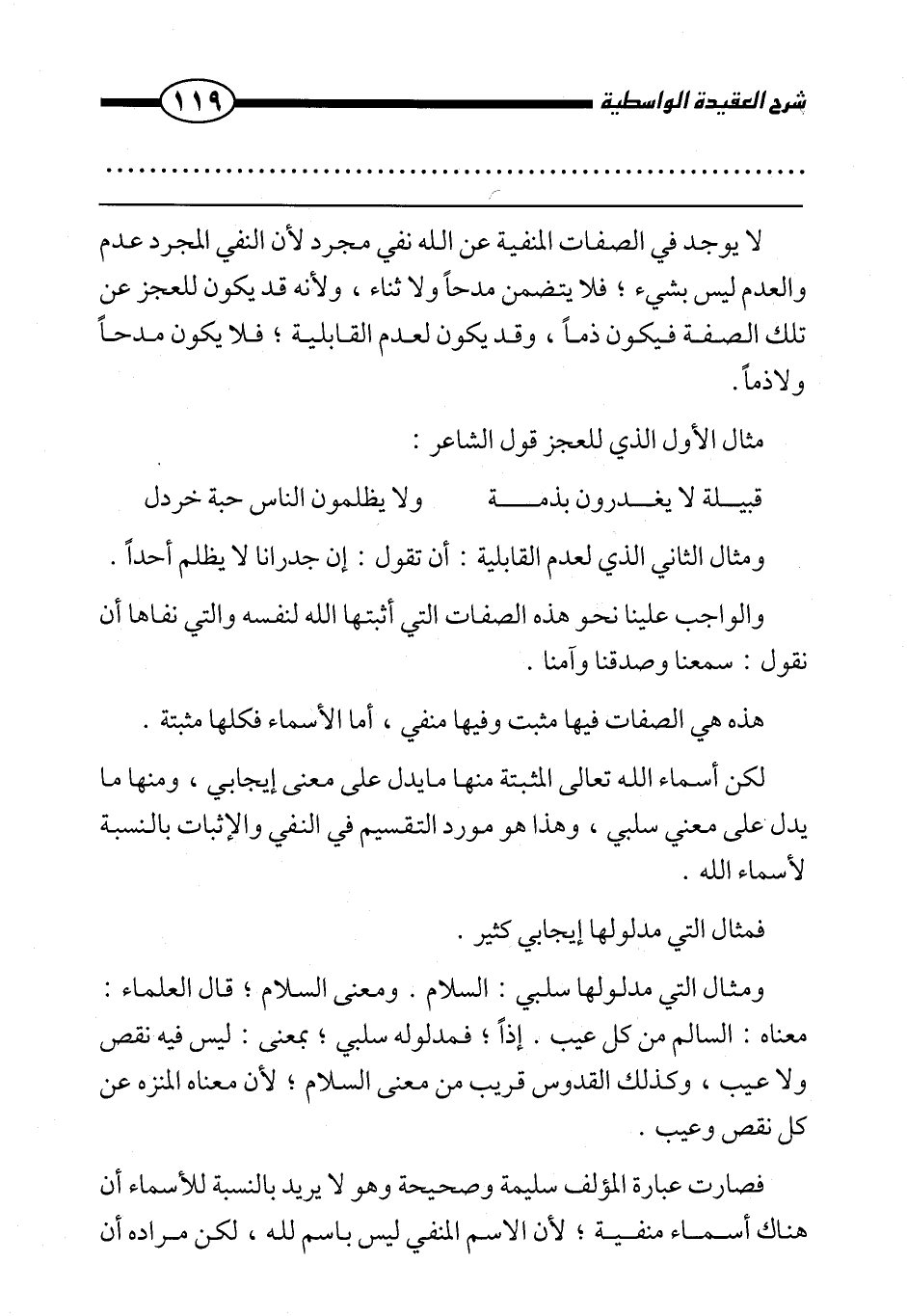 لا يوجد في الصفات المنفية عن الله نفي مجرد لأن النفي المجرد عدم والعدم ليس بشيء، فلا يتضمن مدحًا ولا ثناء، ولأنه قد يكون للعجز عن تلك الصفة فيكون ذمًا، وقد يكون لعدم القابلية، فلا يكون مدحًا ولا ذمًا.