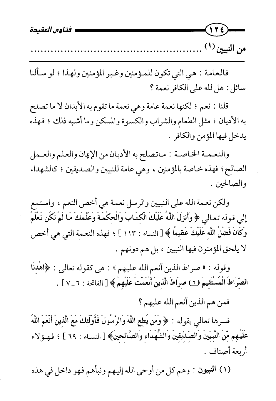والنعمة الخاصة: ما تصلح به الأديان من الإيمان والعلم والعمل الصالح، فهذه خاصة بالمؤمنين، وهي عامة للنبيين والصديقين، كالشهداء والصالحين.