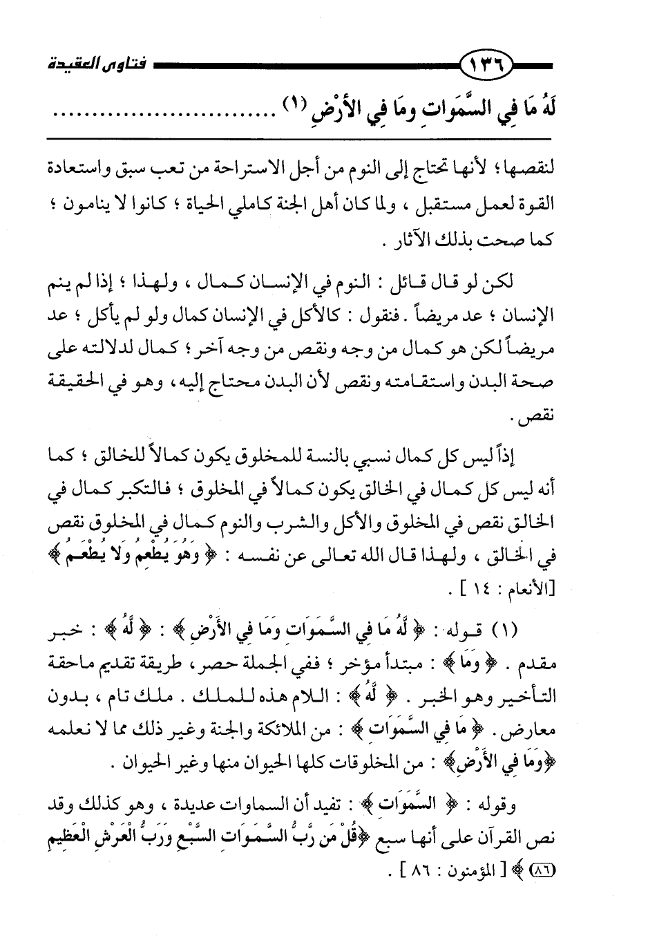 لكن لو قال قائل: النوم في الإنسان كمال، ولهذا، إذا لم ينم الإنسان، عُد مريضًا. فنقول: كالأكل في الإنسان كمال ولو لم يأكل، عد مريضًا لكن هو كمال من وجه ونقص من وجه آخر، كمال لدلالته على صحة البدن واستقامته، ونقص لأن البدن محتاج إليه، وهو في الحقيقة نقص.