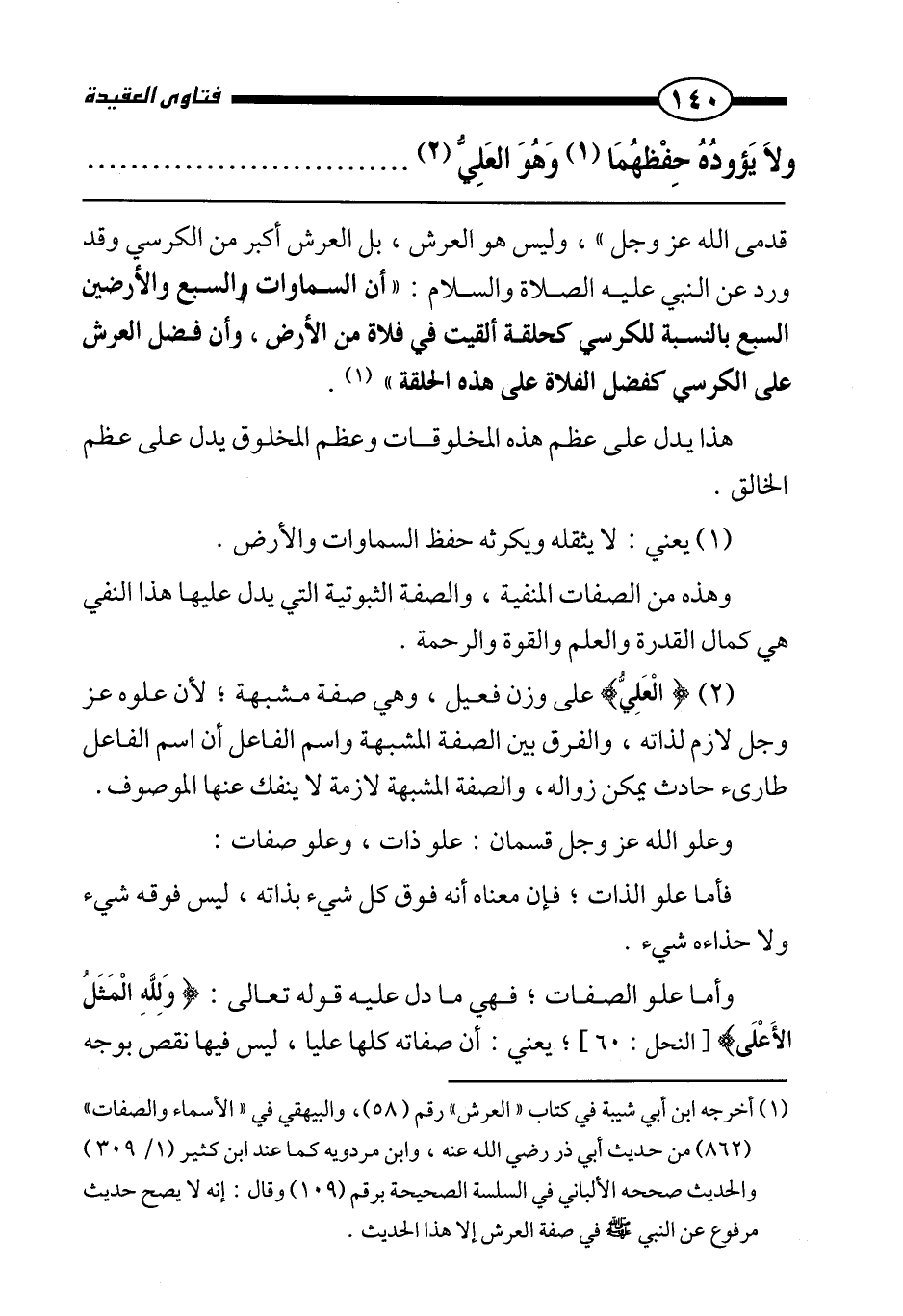 وأما علو الصفات، فهي ما دل عليه قوله تعالى: {وَلِلَّهِ الْمَثَلُ الْأَعْلَى} [النحل: 60] ، يعني: أن صفاته كلها عليًا، ليس فيها نقص بوجه