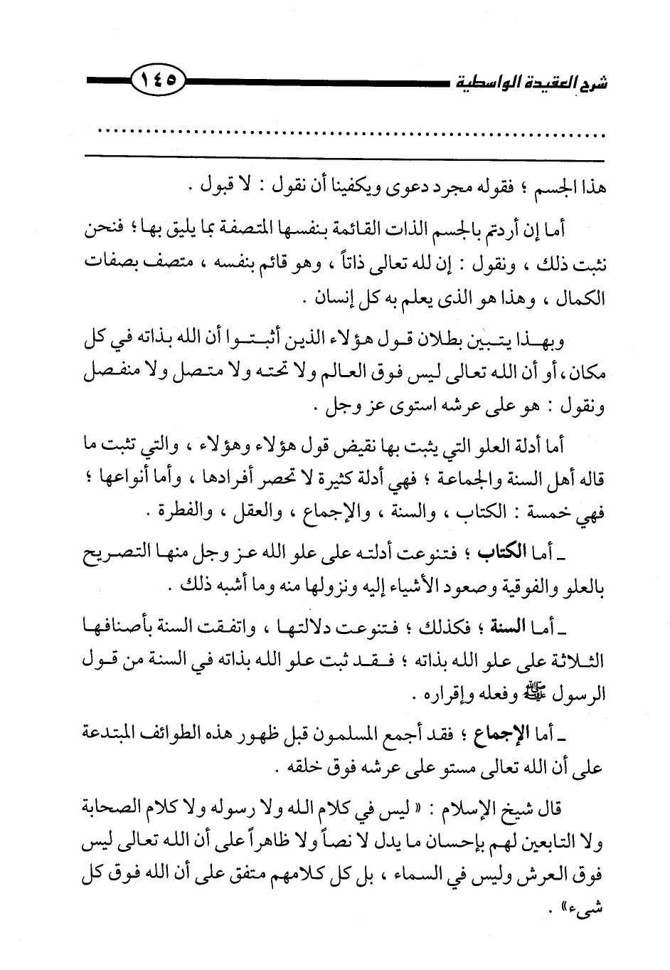قال شيخ الإسلام: "ليس في كلام الله ولا رسوله، ولا كلام الصحابة ولا التابعين لهم بإحسان ما يدل لا نصًا ولا ظاهرًا على أن الله تعالى ليس فوق العرش وليس في السماء، بل كل كلامهم متفق على أن الله فوق كل شيء".
