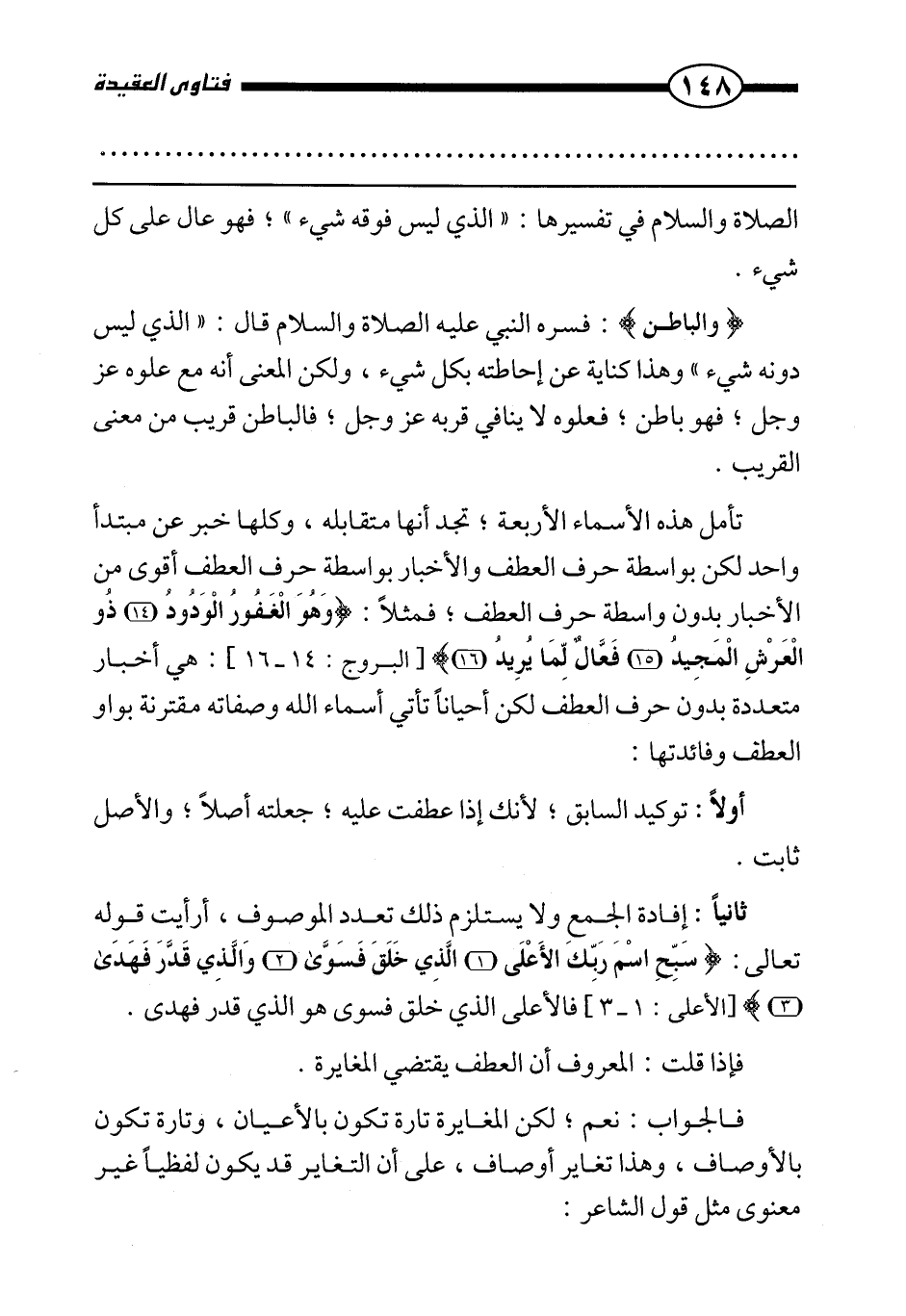 تأمل هذه الأسماء الأربعة، تجد أنها متقابلة، وكلها خبر عن مبتدأ واحد لكن بواسطة حرف العطف، والأخبار بواسطة حرف العطف أقوى من الأخبار بدون واسطة حرف العطف، فمثلا: {وَهُوَ الْغَفُورُ الْوَدُودُ ذُو الْعَرْشِ الْمَجِيدُ فَعَّالٌ لِمَا يُرِيدُ} [البروج: 14 - 16] : هي أخبار متعددة بدون حرف العطف لكن أحيانًا تأتي أسماء الله وصفاته مقترنة بواو العطف وفائدتها: