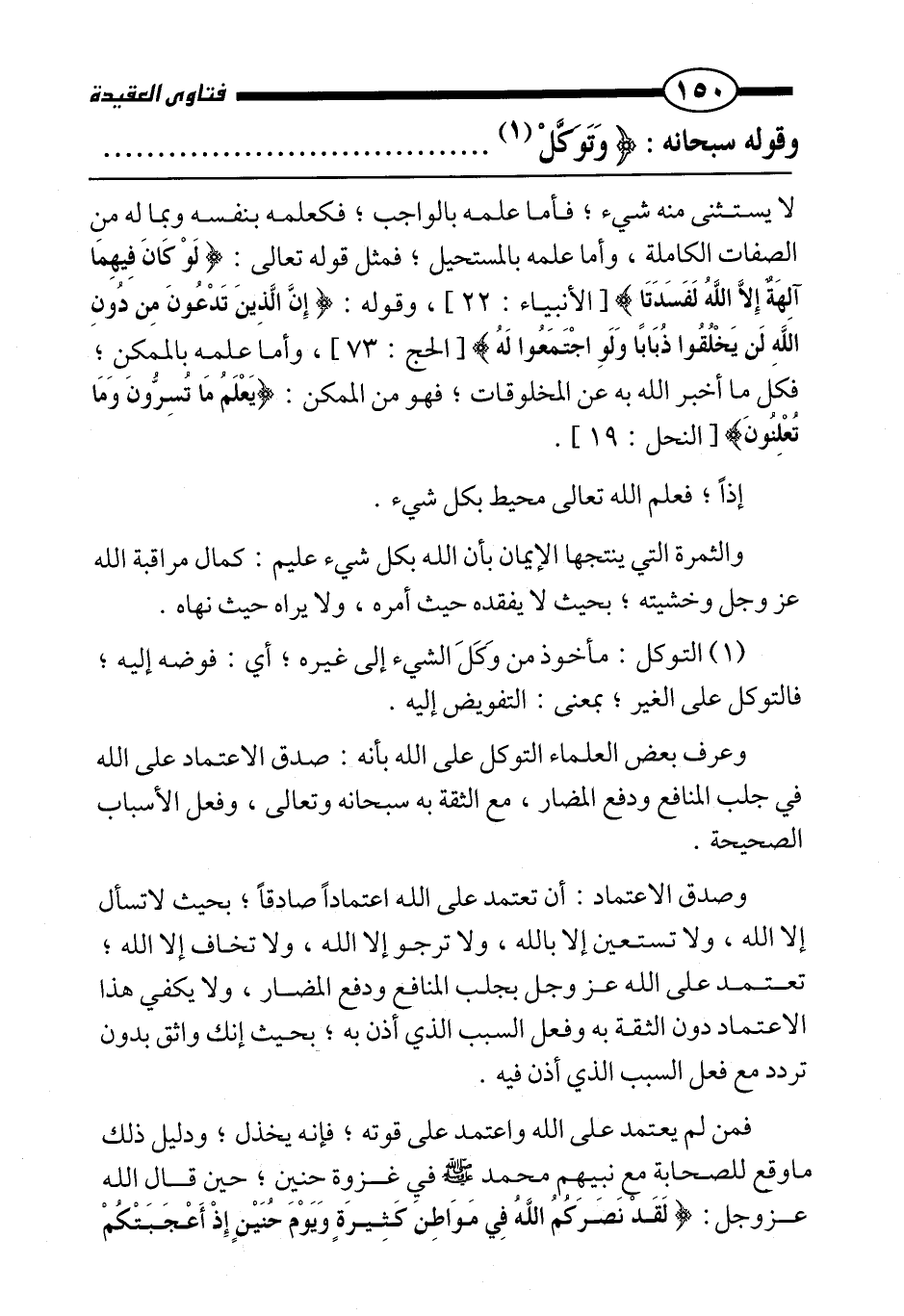 فمن لم يعتمد على الله واعتمد على قوته، فإنه يخذل، ودليل ذلك ما وقع للصحابة مع نبيهم محمد صَلَّى اللَّهُ عَلَيْهِ وَسَلَّمَ في غزوة حنين، حين قال الله عز وجل: {لَقَدْ نَصَرَكُمُ اللَّهُ فِي مَوَاطِنَ كَثِيرَةٍ وَيَوْمَ حُنَيْنٍ إِذْ أَعْجَبَتْكُمْ كَثْرَتُكُمْ} ،
