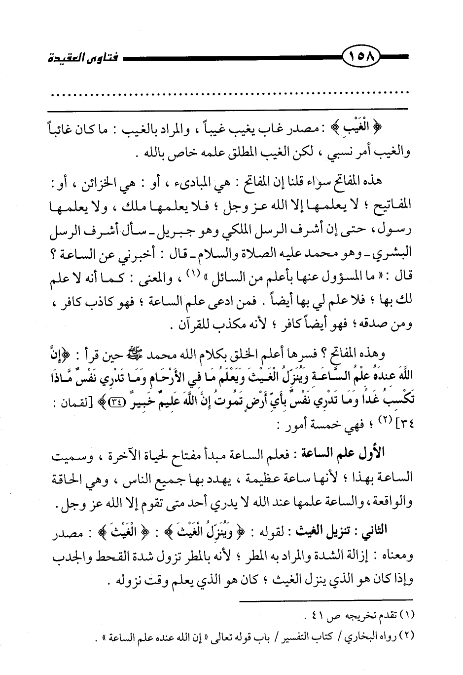 هذه المفاتح سواء قلنا إن المفاتح: هي المبادئ، أو: هي الخزائن، أو: المفاتيح، لا يعلمها إلا الله عز وجل، فلا يعلمها ملك، ولا يعلمها رسول، حتى إن أشرف الرسل الملكي وهو جبريل - سأل أشرف الرسل البشري - وهو محمد عليه الصلاة والسلام - قال: أخبرني عن الساعة؟ قال: «ما المسؤول عنها بأعلم من السائل» ، والمعنى: كما أنه لا علم لك بها، فلا علم لي بها أيضًا. فمن ادعى علم الساعة، فهو كاذب كافر، ومن صدقه، فهو أيضًا كافر، لأنه مكذب للقرآن.