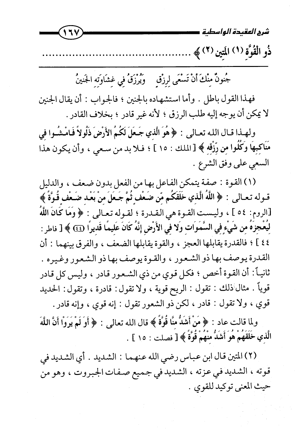 القوة: صفة يتمكن الفاعل بها من الفعل بدون ضعف، والدليل قوله تعالى: {اللَّهُ الَّذِي خَلَقَكُمْ مِنْ ضَعْفٍ ثُمَّ جَعَلَ مِنْ بَعْدِ ضَعْفٍ قُوَّةً} [الروم: 54] ، وليست القوة هي القدرة، لقوله تعالى: {وَمَا كَانَ اللَّهُ لِيُعْجِزَهُ مِنْ شَيْءٍ فِي السَّمَاوَاتِ وَلَا فِي الْأَرْضِ إِنَّهُ كَانَ عَلِيمًا قَدِيرًا} [فاطر: 44] ، فالقدرة يقابلها العجز، والقوة يقابلها الضعف، والفرق بينهما: أن القدرة يوصف بها ذو الشعور، والقوة يوصف بها ذو الشعور وغيره. ثانيًا: أن القوة أخص فكل قوي من ذي الشعور قادر، وليس كل قادر قويا. مثال ذلك: تقول: الريح قوية، ولا تقول: قادرة، وتقول: الحديد قوي، ولا تقول: قادر، لكنْ ذو الشعور تقول: إنه قوي، وإنه قادر.
