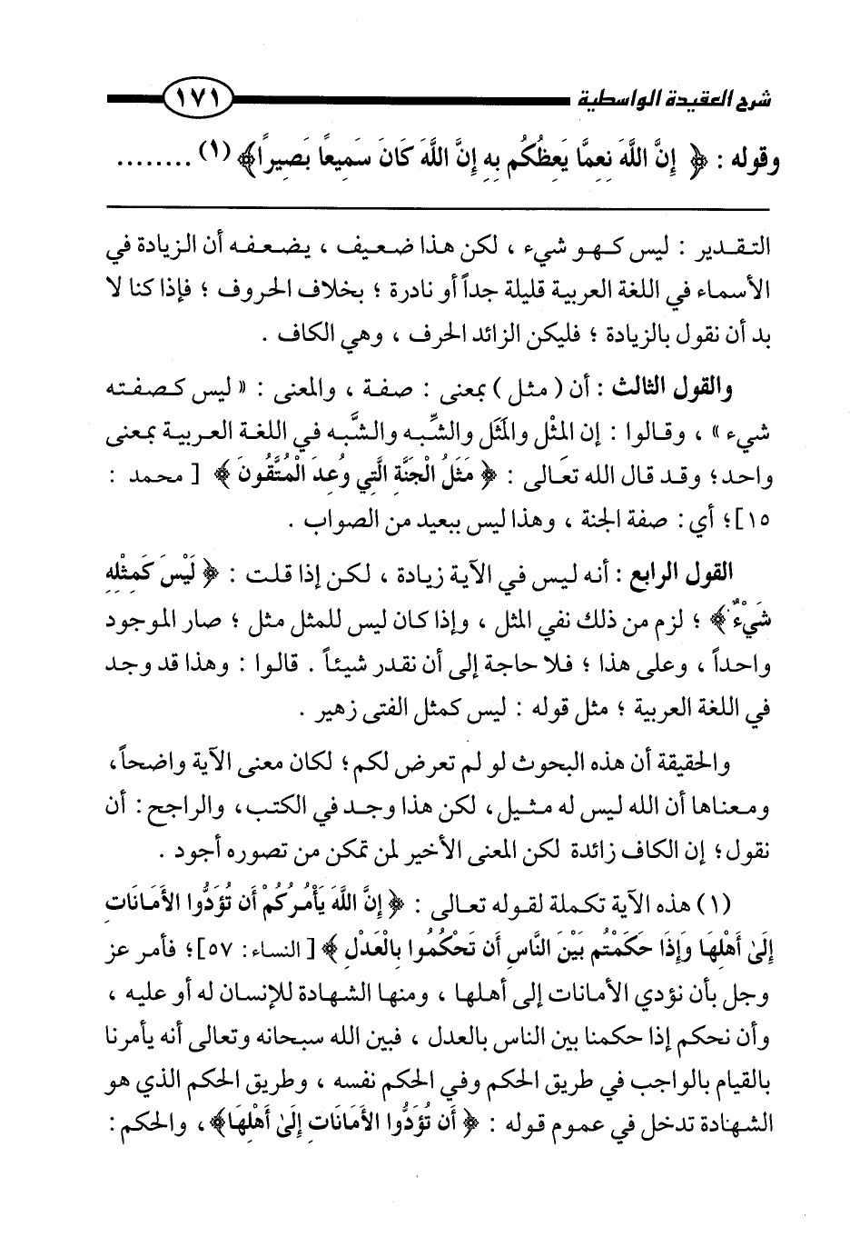 القول الرابع: إنه ليس في الآية زيادة، لكن إذا قلت: {لَيْسَ كَمِثْلِهِ شَيْءٌ} ، لزم من ذلك نفي المثل، وإذا كان ليس للمثل مثل، صار الموجود واحدًا، وعلى هذا، فلا حاجة إلى أن نقدر شيئًا. قالوا: وهذا قد وجد في اللغة العربية، مثل قوله: ليس كمثل الفتى زهير.