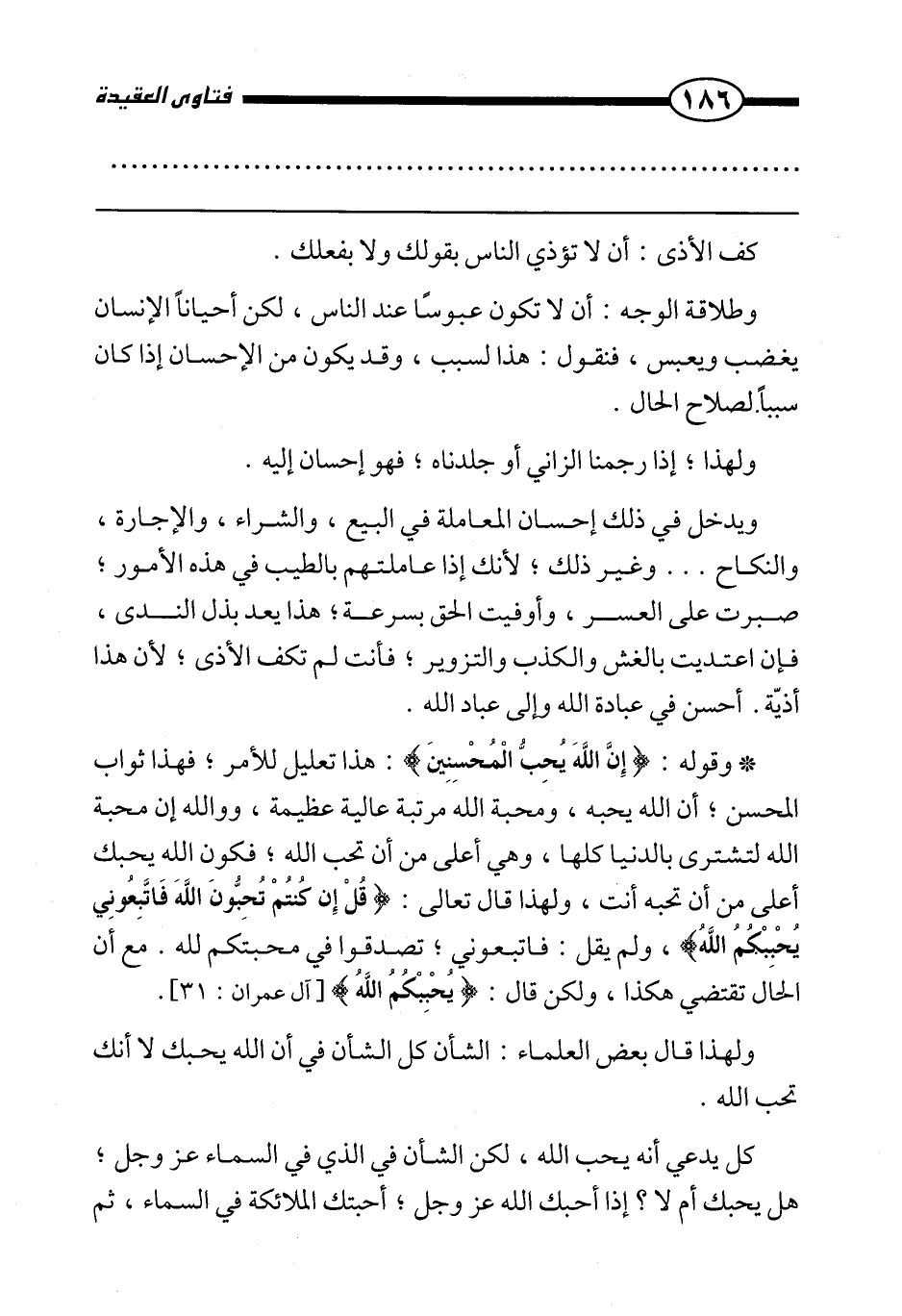 * وقوله: {إِنَّ اللَّهَ يُحِبُّ الْمُحْسِنِينَ} : هذا تعليل للأمر، فهذا ثواب المحسن، أن الله يحبه، ومحبة الله مرتبة عالية عظيمة، ووالله إن محبة الله لتشترى بالدنيا كلها، وهي أعلى من أن تحب الله، فكون الله يحبك أعلى من أن تحبه أنت، ولهذا قال تعالى: {قُلْ إِنْ كُنْتُمْ تُحِبُّونَ اللَّهَ فَاتَّبِعُونِي يُحْبِبْكُمُ اللَّهُ} ، ولم يقل: فاتبعوني، تصدقوا في محبتكم لله. مع أن الحال تقتضي هكذا، ولكن قال: {يُحْبِبْكُمُ اللَّهُ} [آل عمران: 31] .
