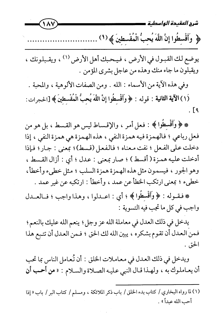 * {وَأَقْسِطُوا} : فعل أمر، والإقساط ليس هو القسط، بل هو من فعل رباعي، فالهمزة فيه همزة النفي، هذه الهمزة هي همزة النفي، إذا دخلت على الفعل، نفت معناه، فالفعل (قسط) ، بمعنى: جار، فإذا أدخلت عليه همزة (أقسط) ، صار بمعنى: عدل، أي: أزال القسط، وهو الجور، فيسمون مثل هذه الهمزة همزة السلب، مثل خطئ وأخطأ، خطئ، بمعنى ارتكب الخطأ عن عمد، وأخطأ: ارتكبه عن غير عمد.