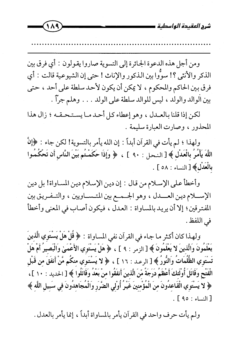 ولهذا كان أكثر ما جاء في القرآن نفي المساواة: {قُلْ هَلْ يَسْتَوِي الَّذِينَ يَعْلَمُونَ وَالَّذِينَ لَا يَعْلَمُونَ} [الزمر: 9] ، {هَلْ يَسْتَوِي الْأَعْمَى وَالْبَصِيرُ أَمْ هَلْ تَسْتَوِي الظُّلُمَاتُ وَالنُّورُ} [الرعد: 16] ، {لَا يَسْتَوِي مِنْكُمْ مَنْ أَنْفَقَ مِنْ قَبْلِ الْفَتْحِ وَقَاتَلَ أُولَئِكَ أَعْظَمُ دَرَجَةً مِنَ الَّذِينَ أَنْفَقُوا مِنْ بَعْدُ وَقَاتَلُوا} [الحديد: 10] ، {لَا يَسْتَوِي الْقَاعِدُونَ مِنَ الْمُؤْمِنِينَ غَيْرُ أُولِي الضَّرَرِ وَالْمُجَاهِدُونَ فِي سَبِيلِ اللَّهِ} [النساء: 95] .