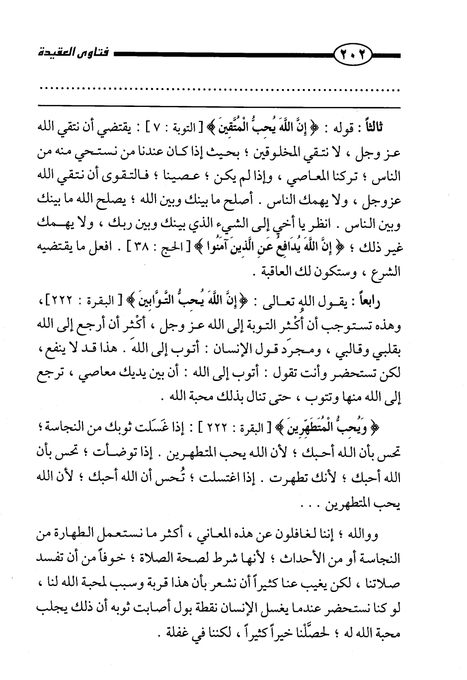{وَيُحِبُّ الْمُتَطَهِّرِينَ} [البقرة: 222] إذا غسلت ثوبك من النجاسة، تحس بأن الله أحبك؛ لأن الله يحب المتطهرين؛ إذا توضأت تحس بأن الله أحبك؛ لأنك تطهرت؛ إذا اغتسلت تحس أن الله أحبك؛ لأن الله يحب المتطهرين....