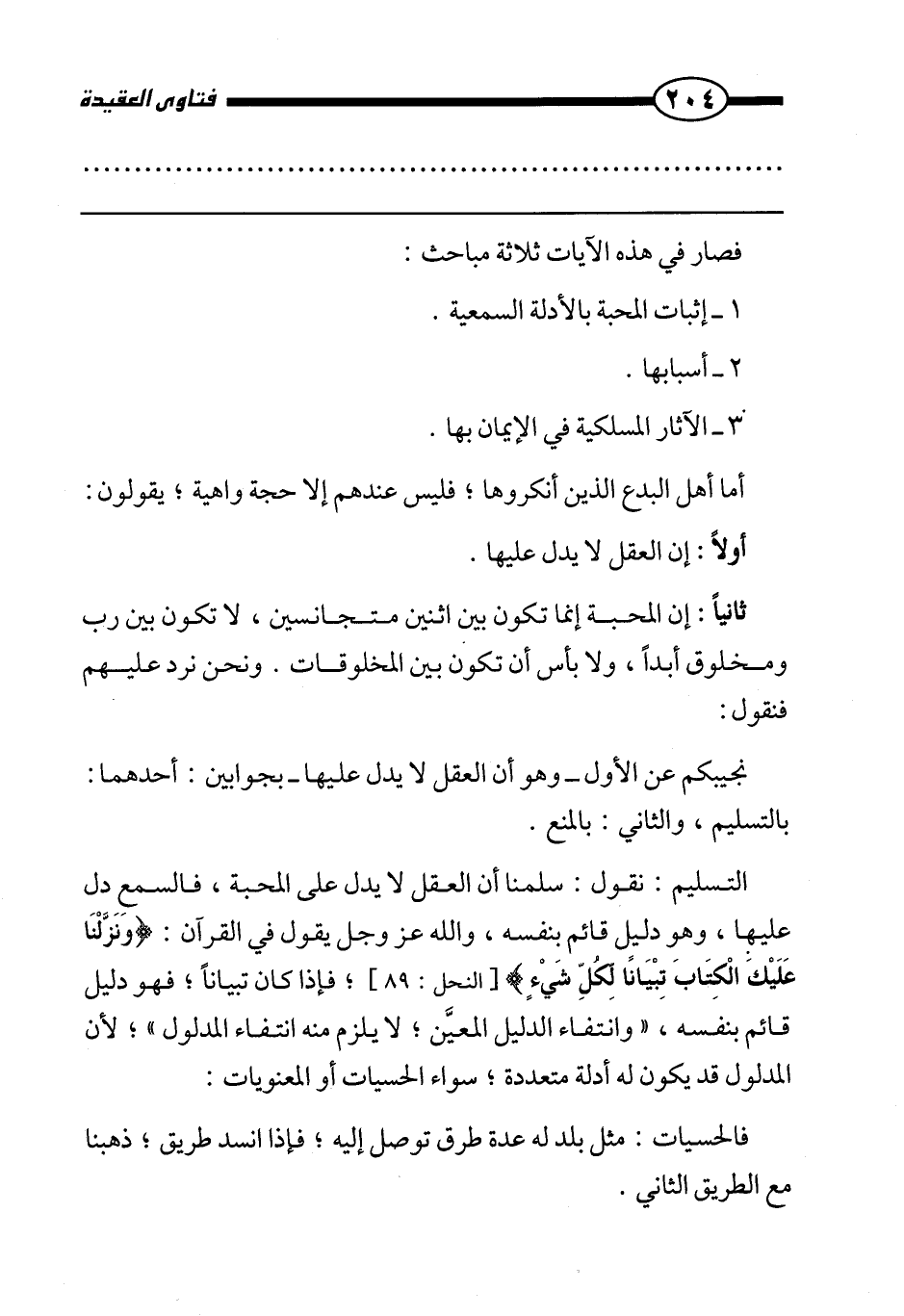 التسليم: نقول: سلمنا أن العقل لا يدل على المحبة، فالسمع دل عليها، وهو دليل قائم بنفسه، والله عز وجل يقول في القرآن: {وَنَزَّلْنَا عَلَيْكَ الْكِتَابَ تِبْيَانًا لِكُلِّ شَيْءٍ} [النحل: 89] ،فإذا كان تبيانًا، فهو دليل قائم بنفسه، "وانتفاء الدليل المعين لا يلزم منه انتفاء المدلول"؛ لأن المدلول قد يكون له أدلة متعددة، سواء الحسيات أو المعنويات: