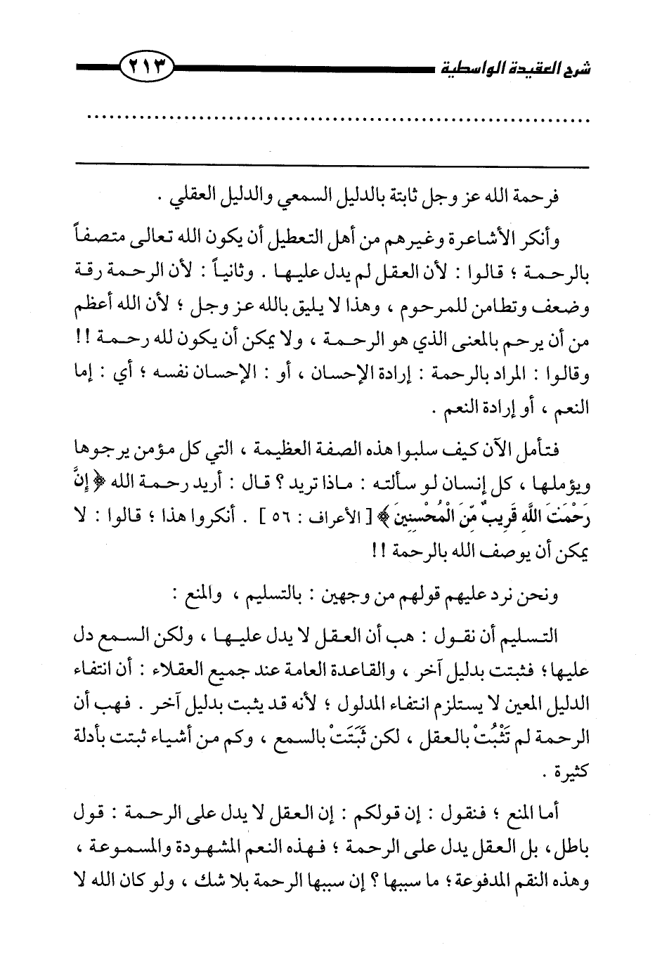 التسليم أن نقول: هب أن العقل لا يدل عليها، ولكن السمع دل عليها، فثبتت بدليل آخر، والقاعدة العامة عند جميع العقلاء: أن انتفاء الدليل المعين لا يستلزم انتفاء المدلول؛ لأنه قد يثبت بدليل آخر. فهب أن الرحمة لم تثبت بالعقل، لكن ثبتت بالسمع، وكم من أشياء ثبتت بأدلة كثيرة.