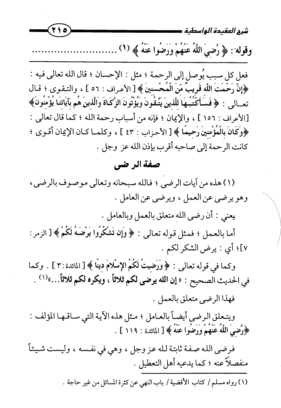 فرضى الله صفة ثابتة لله عز وجل، وهي في نفسه، وليست شيئًا منفصلًا عنه كما يدعيه أهل التعطيل.