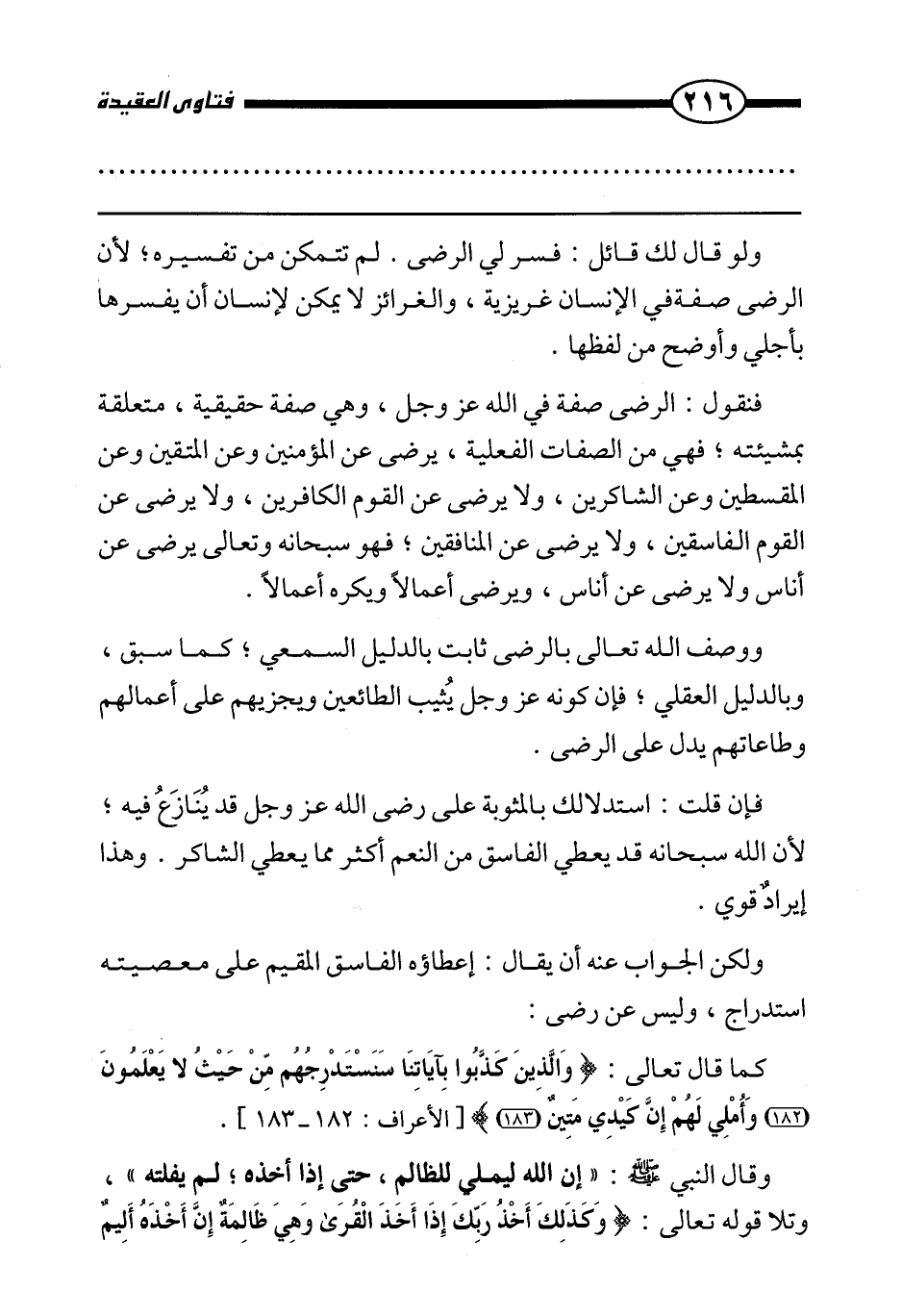 ولو قال لك قائل: فسر لي الرضى. لم تتمكن من تفسيره؛ لأن الرضى صفة في الإنسان غريزية، والغرائز لا يمكن لإنسان أن يفسرها بأجلى وأوضح من لفظها. فنقول: الرضى صفة في الله عز وجل، وهي صفة حقيقية، متعلقة بمشيئته، فهي من الصفات الفعلية، يرضى عن المؤمنين،وعن المتقين،وعن المقسطين وعن الشاكرين، ولا يرضى عن القوم الكافرين، ولا يرضى عن القوم الفاسقين، ولا يرضى عن المنافقين، فهو سبحانه وتعالى يرضى عن أناس ولا يرضى عن أناس، ويرضى أعمالًا ويكره أعمالًا.