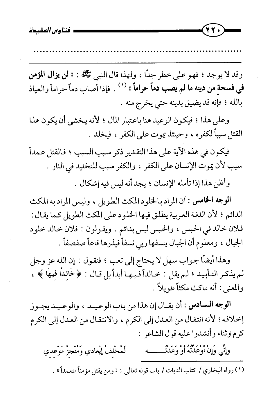 الوجه السادس: أن يقال: إن هذا من باب الوعيد، والوعيد يجوز إخلافه؛ لأنه انتقال من العدل إلى الكرم، والانتقال من العدل إلى الكرم كرم وثناء،وأنشدوا عليه قول الشاعر: