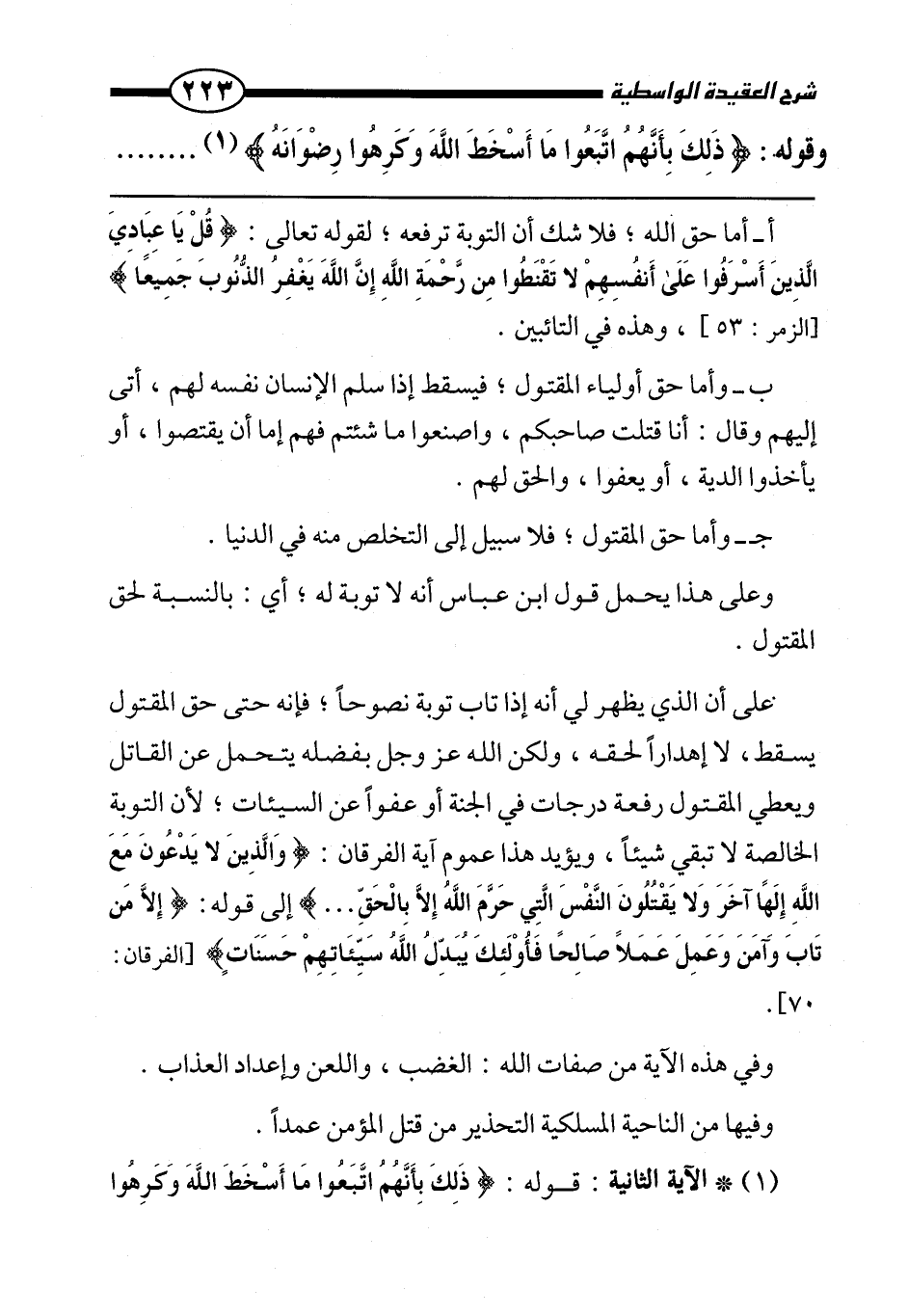 على أن الذي يظهر لي أنه إذا تاب توبة نصوحًا، فإنه حتى حق المقتول يسقط، لا إهدارًا لحقه، ولكن الله عز وجل بفضله يتحمل عن القاتل، ويعطي المقتول رفعة درجات في الجنة أو عفوًا عن السيئات؛ لأن التوبة الخالصة لا تبقي شيئًا، ويؤيد هذا عموم آية الفرقان: {وَالَّذِينَ لَا يَدْعُونَ مَعَ اللَّهِ إِلَهًا آخَرَ وَلَا يَقْتُلُونَ النَّفْسَ الَّتِي حَرَّمَ اللَّهُ إِلَّا بِالْحَقِّ} إلى قوله: {إِلَّا مَنْ تَابَ وَآمَنَ وَعَمِلَ عَمَلًا صَالِحًا فَأُولَئِكَ يُبَدِّلُ اللَّهُ سَيِّئَاتِهِمْ حَسَنَاتٍ} [الفرقان: 70] .
