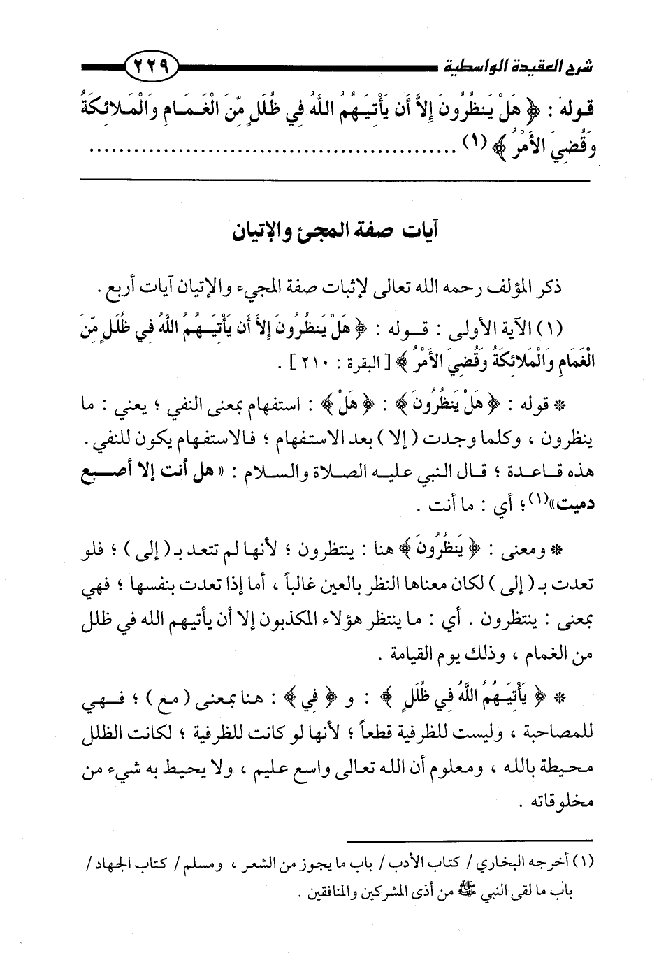 الآية الأولى: قوله: {هَلْ يَنْظُرُونَ إِلَّا أَنْ يَأْتِيَهُمُ اللَّهُ فِي ظُلَلٍ مِنَ الْغَمَامِ وَالْمَلَائِكَةُ وَقُضِيَ الْأَمْرُ} [البقرة: 210] .