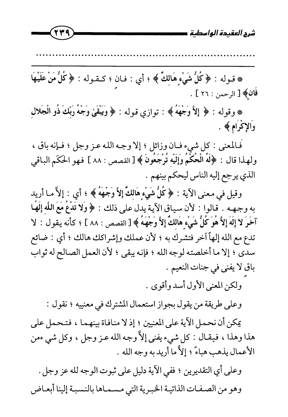 وقيل في معنى الآية: {كُلُّ شَيْءٍ هَالِكٌ إِلَّا وَجْهَهُ} ، أي: إلا ما أريد به وجهه. قالوا: لأن سياق الآية يدل على ذلك: {وَلَا تَدْعُ مَعَ اللَّهِ إِلَهًا آخَرَ لَا إِلَهَ إِلَّا هُوَ كُلُّ شَيْءٍ هَالِكٌ إِلَّا وَجْهَهُ} [القصص: 88] كأنه يقول: لا تدع مع الله إلهًا آخر فتشرك به؛ لأن عملك وإشراكك هالك، أي: ضائع سدى إلا ما أخلصته لوجه الله، فإنه يبقى؛ لأن العمل الصالح له ثواب باقى لا يفنى في جنات النعيم.