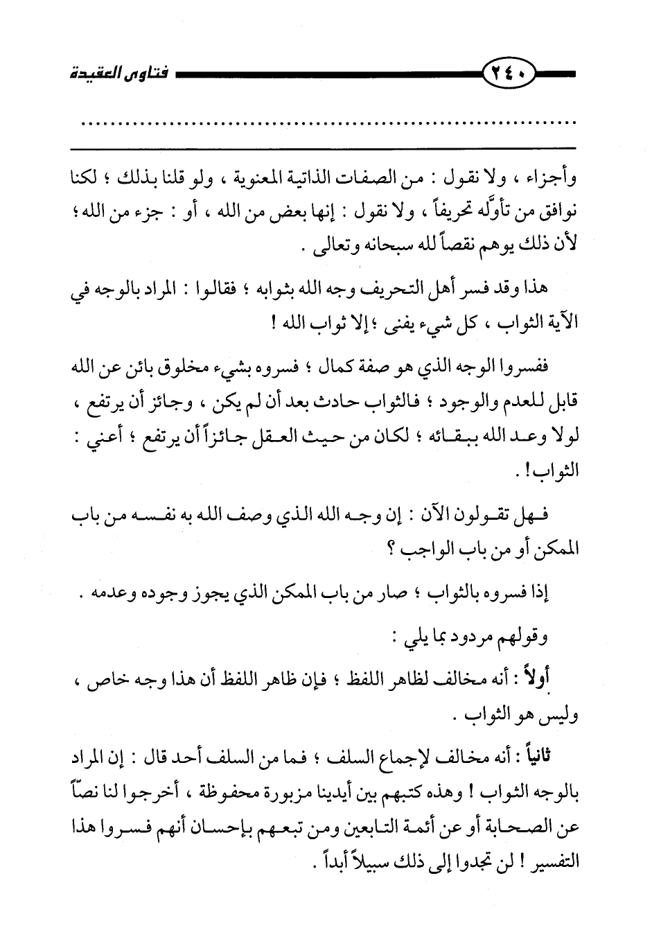 ففسروا الوجه الذي هو صفة كمال، فسروه بشيء مخلوق بائن عن الله قابل للعدم والوجود، فالثواب حادث بعد أن لم يكن، وجائز أن يرتفع، لولا وعد الله ببقائه لكان من حيث العقل جائزًا أن يرتفع، أعني: الثواب.