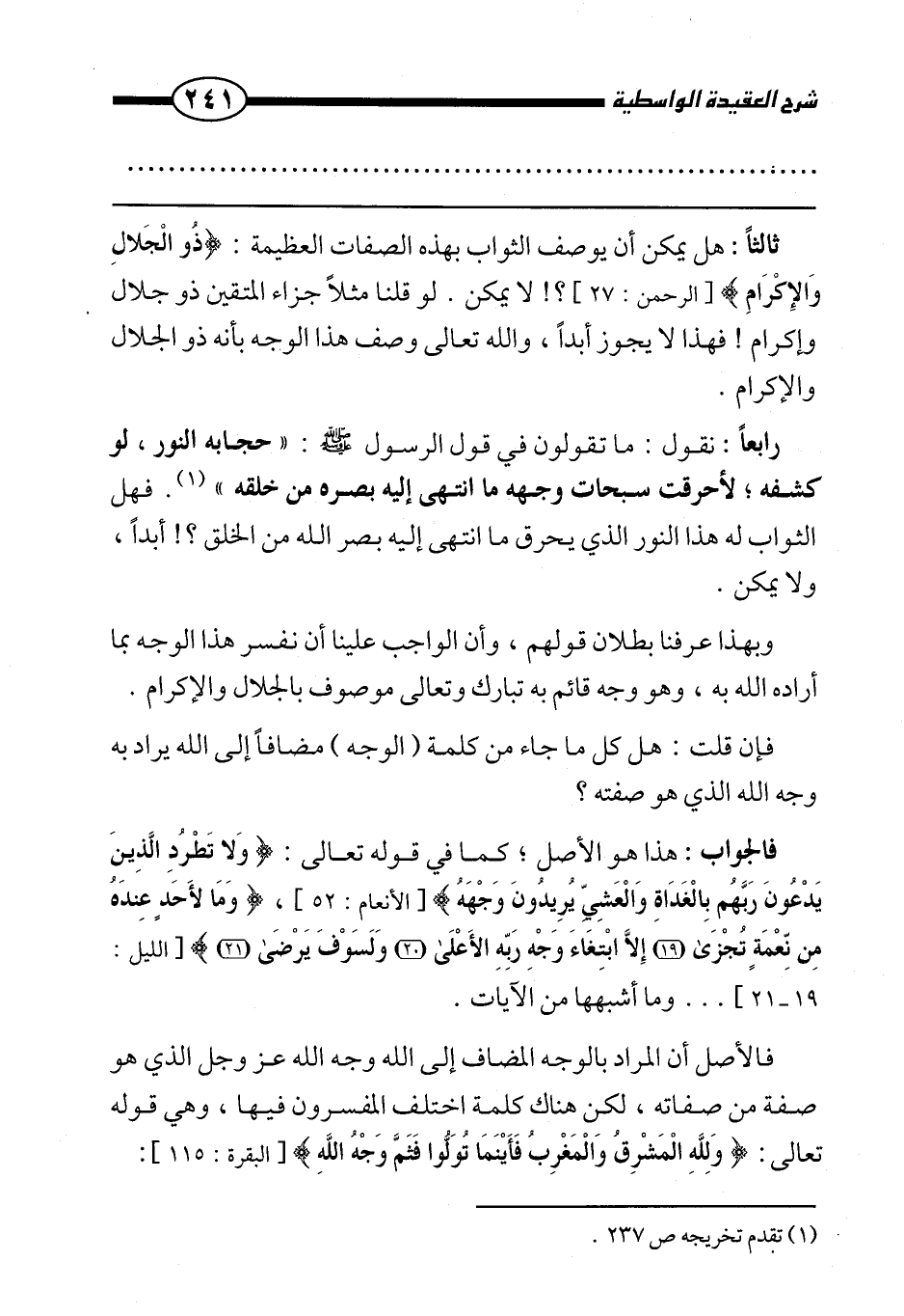 ثالثًا: هل يمكن أن يوصف الثواب بهذه الصفات العظيمة: {ذُو الْجَلَالِ وَالْإِكْرَامِ} [الرحمن: 27] لا يمكن. لو قلنا مثلًا جزاء المتقين ذو جلال وإكرام! فهذا لا يجوز أبدًا، والله تعالى وصف هذا الوجه بأنه ذو الجلال والإكرام.