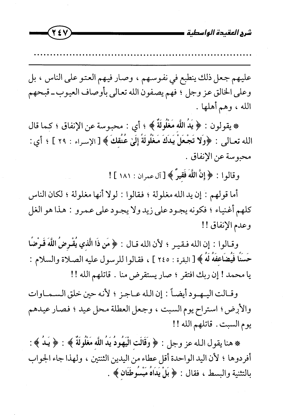 * هنا يقول الله عز وجل: {وَقَالَتِ الْيَهُودُ يَدُ اللَّهِ مَغْلُولَةٌ) : (يَدُ} : أفردوها، لأن اليد الواحد أقل عطاء من اليدين الثنتين؛ ولهذا جاء الجواب بالتثنية والبسط، فقال: {بَلْ يَدَاهُ مَبْسُوطَتَانِ} .