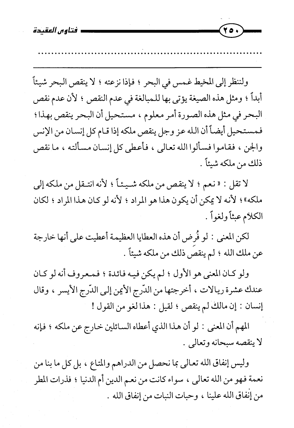 لكن المعنى: لو فرض أن هذه العطايا العظيمة أعطيت على أنها خارجة عن ملك الله، لم ينقص ذلك من ملكه شيئًا. ولو كان المعنى هو الأول، لم يكن فيه فائدة، فمعروف أنه لو كان عندك عشرة ريالات، أخرجتها من الدرج الأيمن إلى الدرج الأيسر، وقال إنسان: إن مالك لم ينقص، لقيل: هذا لغو من القول!