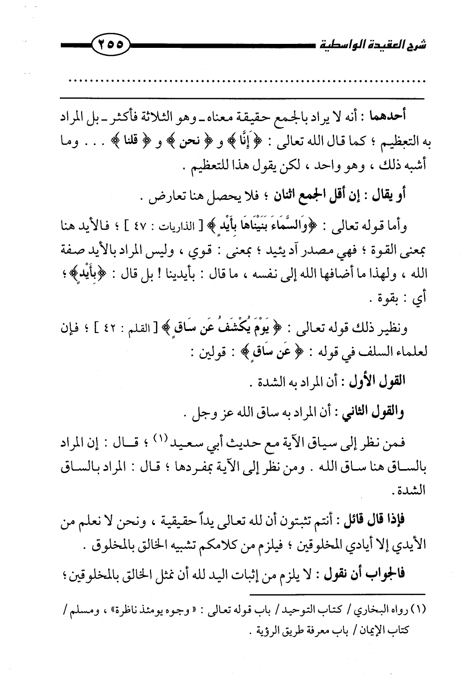 ونظير ذلك قوله تعالى: {يَوْمَ يُكْشَفُ عَنْ سَاقٍ} [القلم: 42] فإن لعلماء السلف في قوله: {عَنْ سَاقٍ} : قولين: