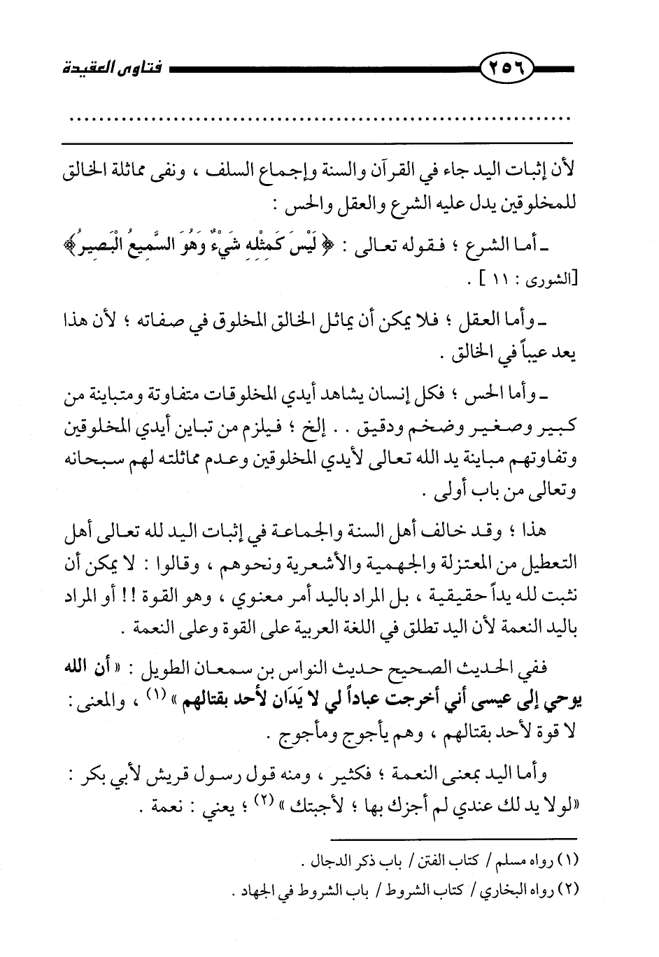 وأما الحس، فكل إنسان يشاهد أيدي المخلوقات متفاوتة ومتباينة من كبير وصغير، وضخم ودقيق.. إلخ، فيلزم من تباين أيدي المخلوقين وتفاوتهم مباينة يد الله تعالى لأيدي المخلوقين وعدم مماثلته لهم سبحانه وتعالى من باب أولى.