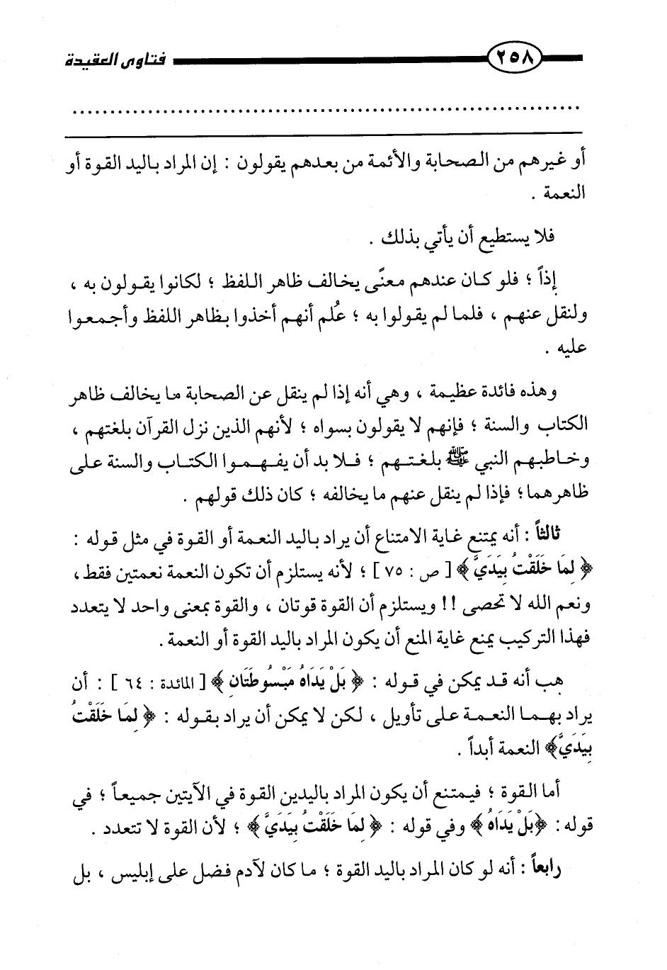 ثالثًا: أنه يمتنع غاية الامتناع أن يراد باليد النعم أو القوة في مثل قوله: {لِمَا خَلَقْتُ بِيَدَيَّ} [ص: 75] لأنه يستلزم أن تكون النعمة نعمتين فقط، ونعم الله لا تحصى!! ويستلزم أن القوة قوتان، والقوة بمعنى واحد لا يتعدد فهذا التركيب يمنع غاية المنع أن يكون المراد باليد القوة أو النعمة.