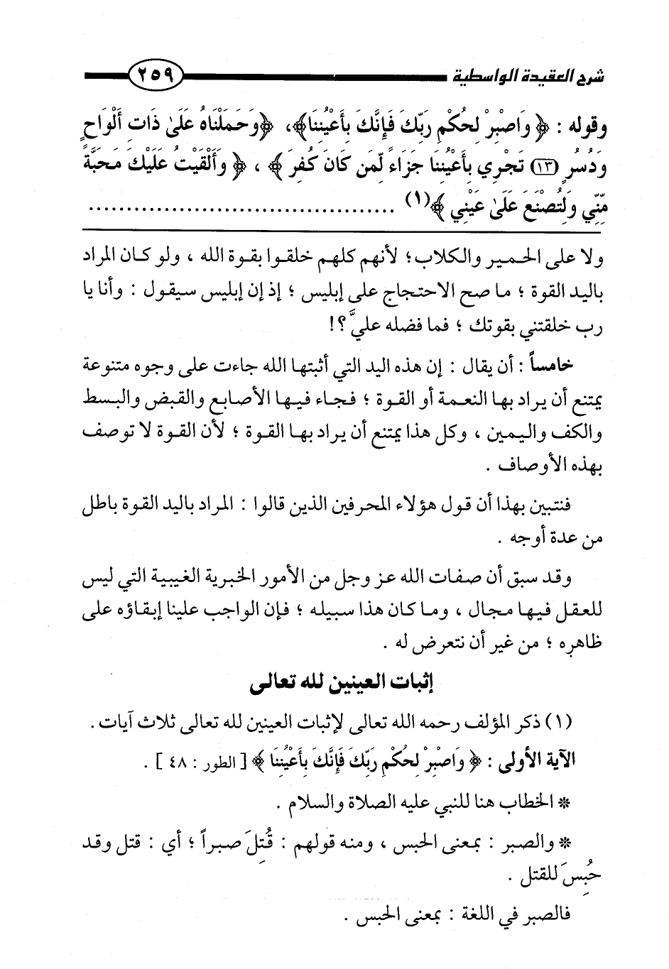 وقوله: {وَاصْبِرْ لِحُكْمِ رَبِّكَ فَإِنَّكَ بِأَعْيُنِنَا} ، {وَحَمَلْنَاهُ عَلَى ذَاتِ أَلْوَاحٍ وَدُسُرٍ} (13) {تَجْرِي بِأَعْيُنِنَا جَزَاءً لِمَنْ كَانَ كُفِرَ} ، {وَأَلْقَيْتُ عَلَيْكَ مَحَبَّةً مِنِّي وَلِتُصْنَعَ عَلَى عَيْنِي} (1) ......