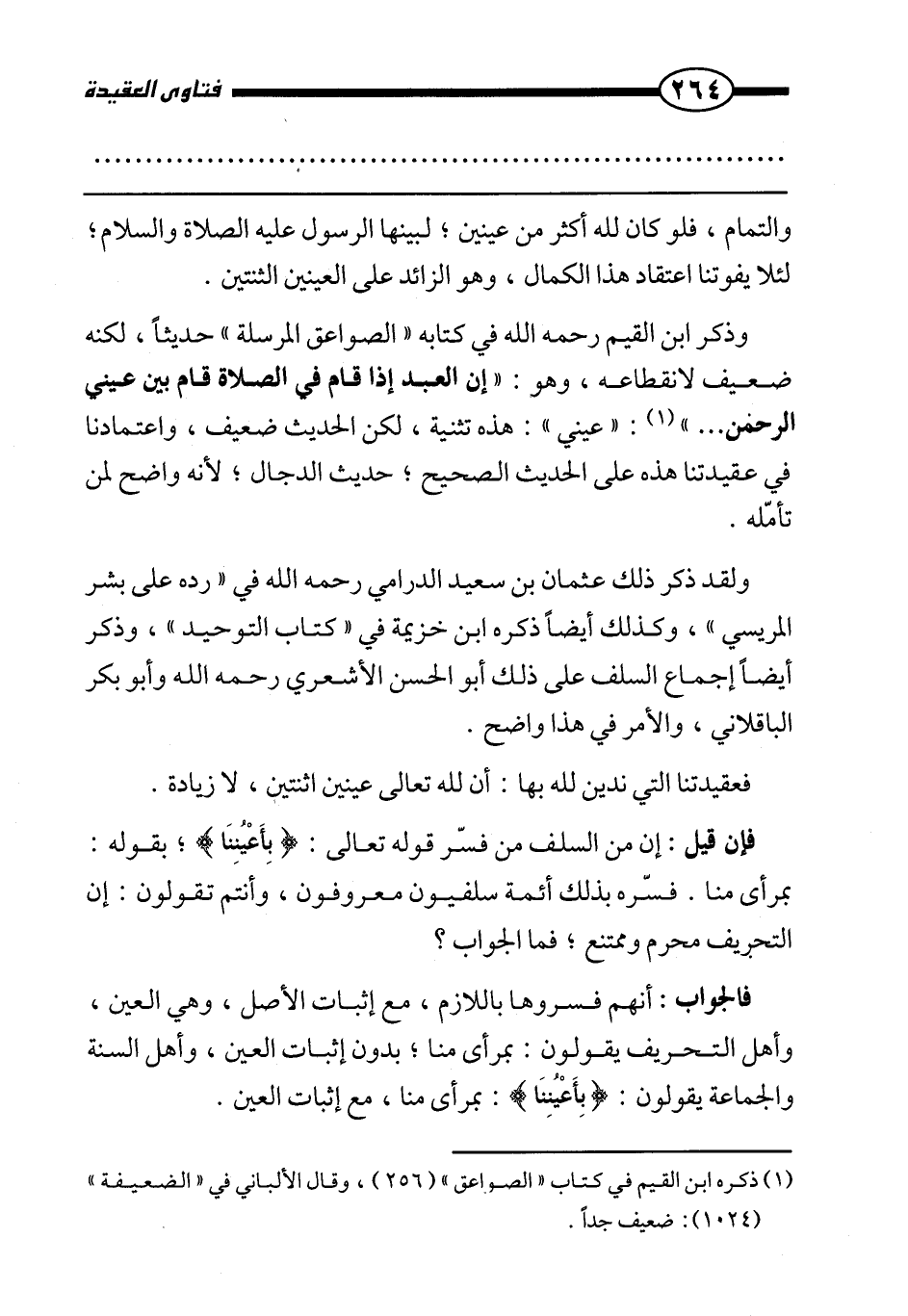وذكر ابن القيم -رحمه الله -في كتابه "الصواعق المرسلة" حديثًا، لكنه ضعيف؛ لانقطاعه، وهو: «إن العبد إذا قام في الصلاة قام بين عيني الرحمن ... "» (¬1) . "عيني" هذه تثنية، لكن الحديث ضعيف، واعتمادنا في عقيدتنا هذه على الحديث الصحيح، حديث الدجال؛ لأنه واضح لمن تأمله.