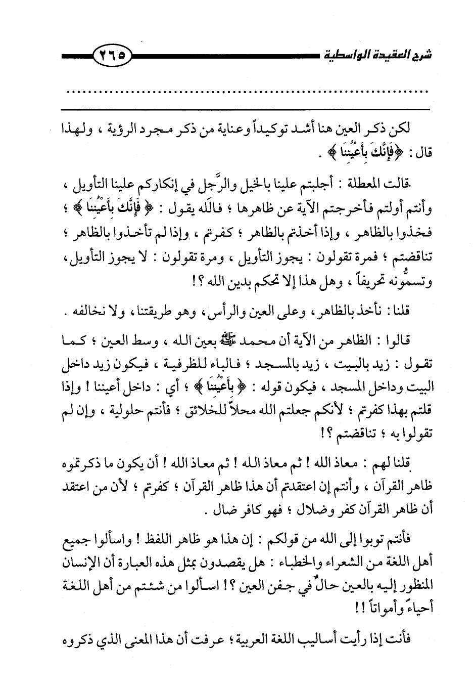 قالت المعطلة: أجلبتم علينا بالخيل والرجل في إنكاركم علينا التأويل، وأنتم أولتم فأخرجتم الآية عن ظاهرها، فالله يقول: {فَإِنَّكَ بِأَعْيُنِنَا} ، فخذوا بالظاهر، وإذا أخذتم بالظاهر كفرتم، وإذا لم تأخذوا بالظاهر تناقضتم، فمرة تقولون: يجوز التأويل، ومرة تقولون: لا يجوز التأويل، وتسمونه تحريفًا، وهل هذا إلا تحكم بدين الله؟ !