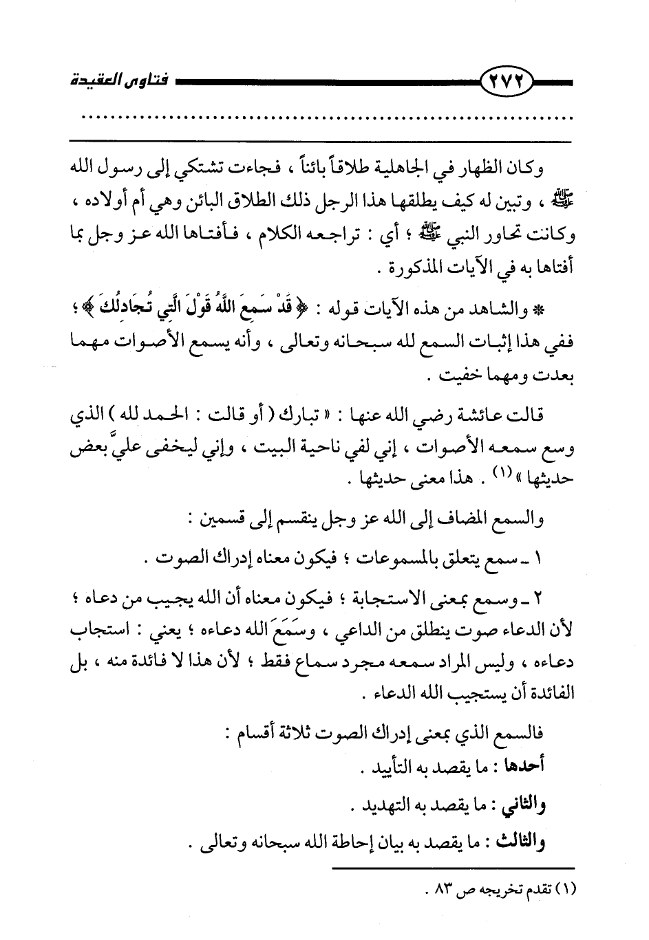 *والشاهد من هذه الآيات قوله: {قَدْ سَمِعَ اللَّهُ قَوْلَ الَّتِي تُجَادِلُكَ} ، ففي هذا إثبات السمع لله سبحانه وتعالى، وأنه يسمع الأصوات مهما بعدت ومهما خفيت.