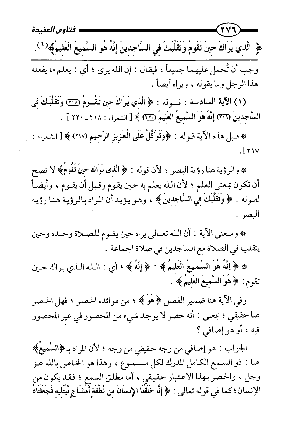 (1) الآية السادسة: قوله: {الَّذِي يَرَاكَ حِينَ تَقُومُ وَتَقَلُّبَكَ فِي السَّاجِدِينَ إِنَّهُ هُوَ السَّمِيعُ الْعَلِيمُ} [الشعراء: 218-220] .