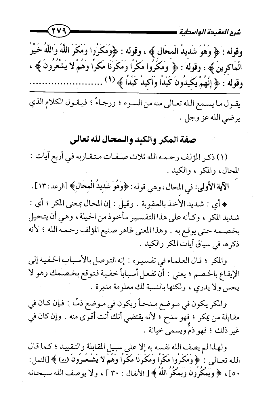 ولهذا لم يصف الله نفسه به إلا على سبيل المقابلة والتقييد؛ كما قال الله تعالى: {وَمَكَرُوا مَكْرًا وَمَكَرْنَا مَكْرًا وَهُمْ لَا يَشْعُرُونَ} [النمل: 50] ، {وَيَمْكُرُونَ وَيَمْكُرُ اللَّهُ} [الأنفال: 30] ، ولا يوصف الله سبحانه