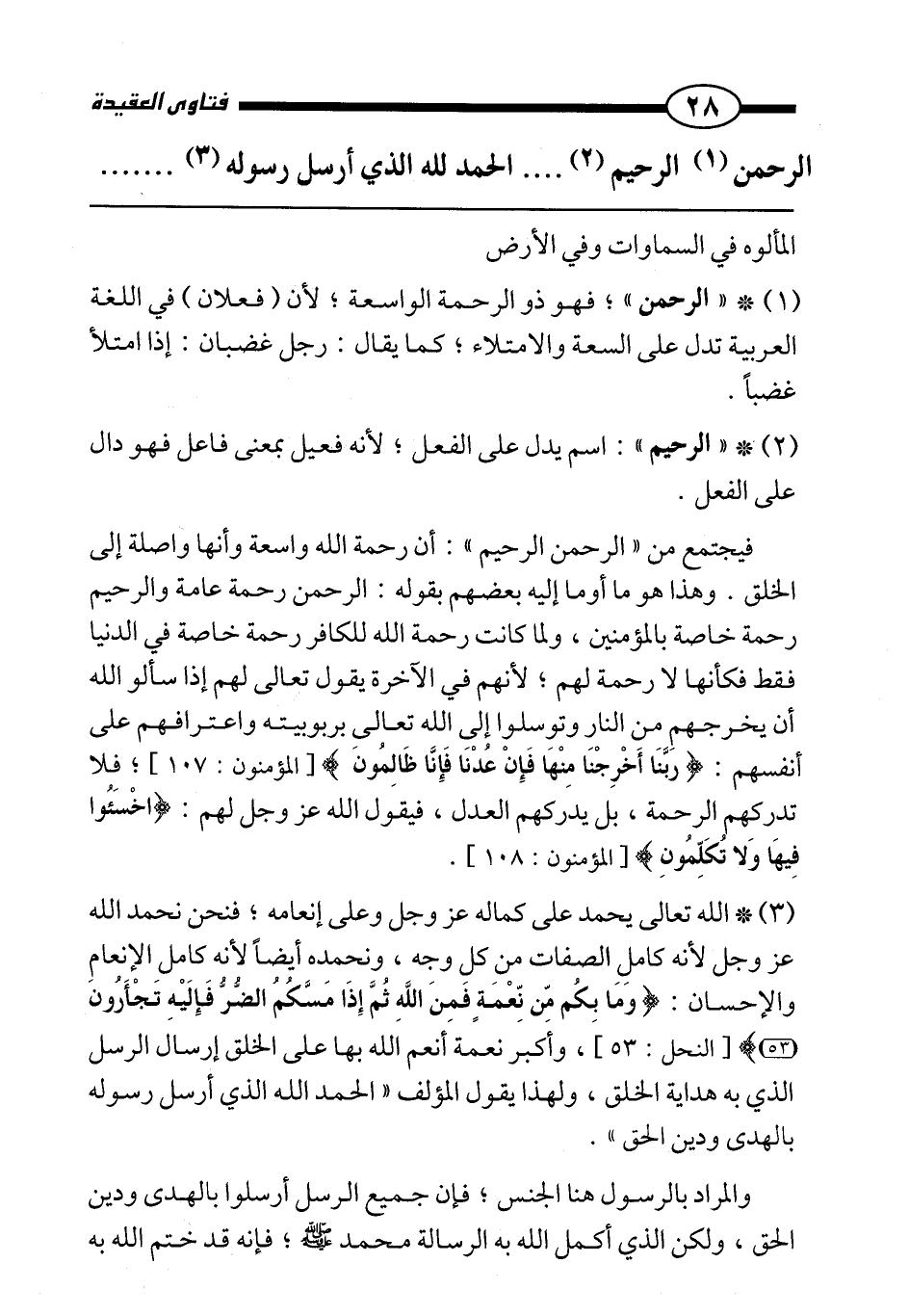 فيجتمع من "الرحمن الرحيم": أن رحمة الله واسعة وأنها واصلة إلى الخلق. وهذا هو ما أوما إليه بعضهم بقوله: الرحمن رحمة عامة والرحيم رحمة خاصة بالمؤمنين، ولما كانت رحمة الله للكافر رحمة خاصة في الدنيا فقط فكأنها لا رحمة لهم؛ لأنهم في الآخرة يقول تعالى لهم إذا سألوا الله أن يخرجهم من النار وتوسلوا إلى الله تعالى بربوبيته واعترافهم على أنفسهم: {رَبَّنَا أَخْرِجْنَا مِنْهَا فَإِنْ عُدْنَا فَإِنَّا ظَالِمُونَ} [المؤمنون: 107] ؛ فلا تدركهم الرحمة، بل يدركهم العدل، فيقول الله عز وجل لهم: {اخْسَئُوا فِيهَا وَلَا تُكَلِّمُونِ} [المؤمنون: 108] .