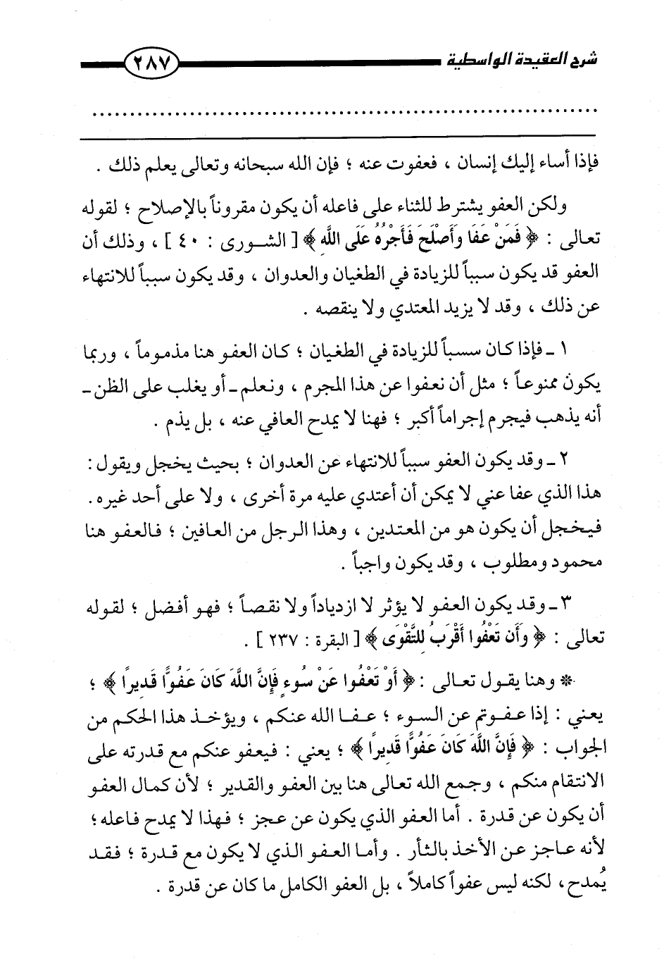 ولكن العفو يشترك للثناء على فاعله أن يكون مقرونًا بالإصلاح؛ لقوله تعالى: {فَمَنْ عَفَا وَأَصْلَحَ فَأَجْرُهُ عَلَى اللَّهِ} [الشورى: 40] ، وذلك أن العفو قد يكون سببًا للزيادة في الطغيان والعدوان، وقد يكون سببًا للانتهاء عن ذلك، وقد لا يزيد المعتدي ولا ينقصه.