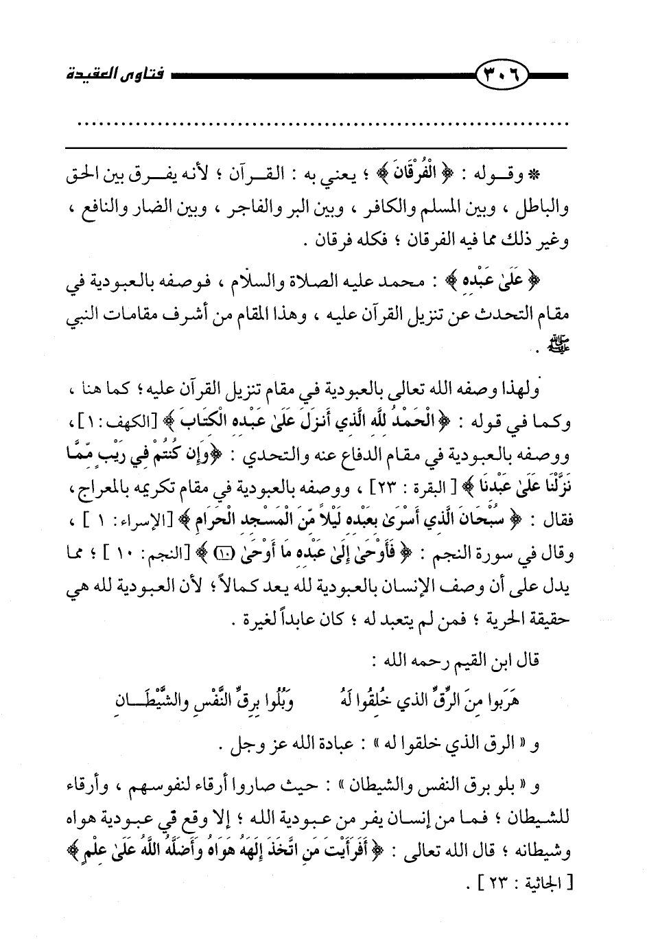 ولهذا وصفه الله تعالى بالعبودية في مقام تنزل القرآن عليه، كما هنا، وكما في قوله: {الْحَمْدُ لِلَّهِ الَّذِي أَنْزَلَ عَلَى عَبْدِهِ الْكِتَابَ} [الكهف: 1] ، ووصفه بالعبودية في مقام الدفاع عنه والتحدي: {وَإِنْ كُنْتُمْ فِي رَيْبٍ مِمَّا نَزَّلْنَا عَلَى عَبْدِنَا} [البقرة: 23] ، ووصفه بالعبودية في مقام تكريمه بالمعراج، فقال: {سُبْحَانَ الَّذِي أَسْرَى بِعَبْدِهِ لَيْلًا مِنَ الْمَسْجِدِ الْحَرَامِ} [الإسراء:1] ، وقال في سورة النجم: {فَأَوْحَى إِلَى عَبْدِهِ مَا أَوْحَى} [النجم: 10] ، مما يدل على أن وصف الإنسان بالعبودية لله يعد كمالا؛ لأن العبودية لله هي حقيقة الحرية، فمن لم يتعبد له، كان عابدا لغيره.
