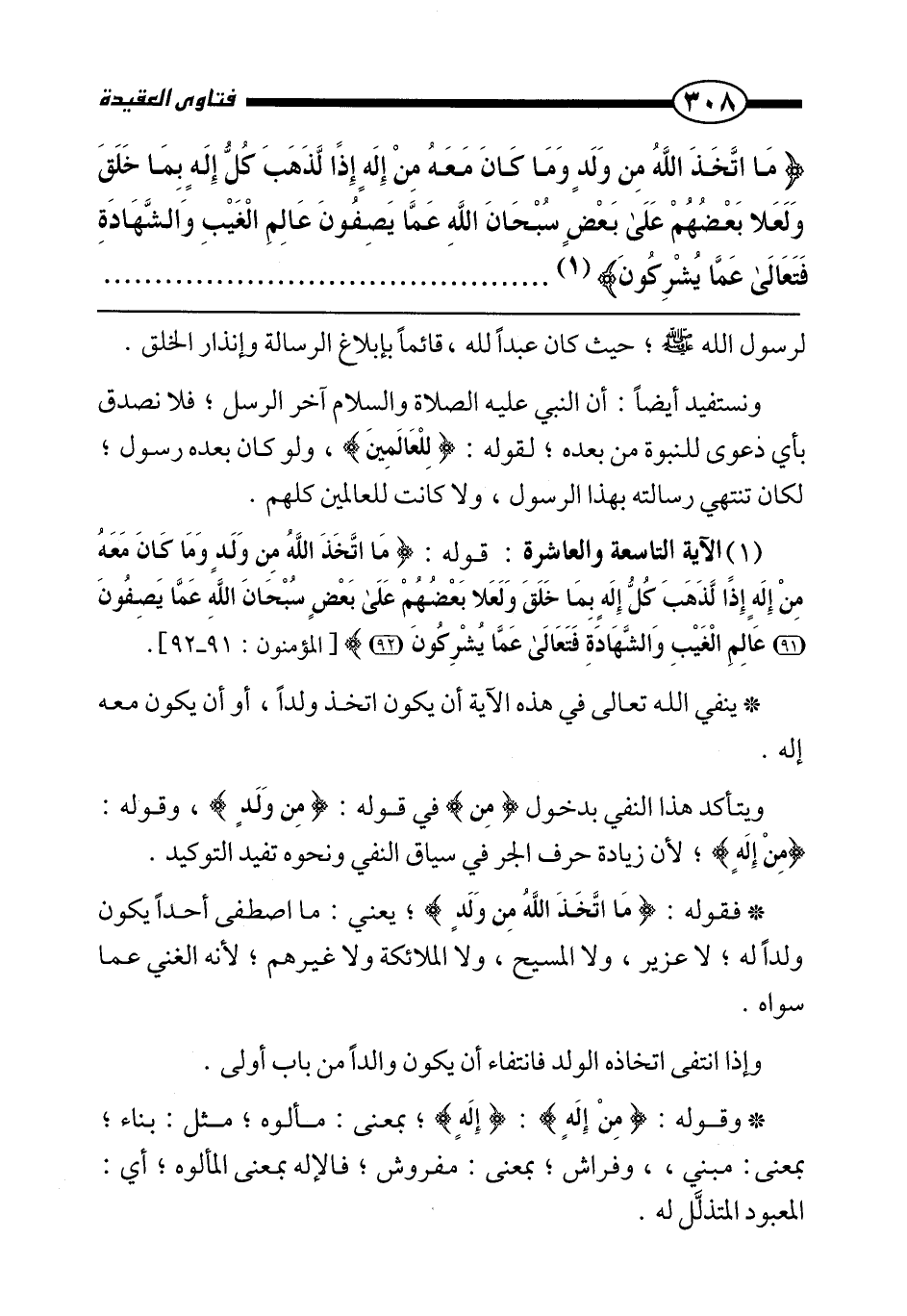 {مَا اتَّخَذَ اللَّهُ مِنْ وَلَدٍ وَمَا كَانَ مَعَهُ مِنْ إِلَهٍ إِذًا لَذَهَبَ كُلُّ إِلَهٍ بِمَا خَلَقَ وَلَعَلَا بَعْضُهُمْ عَلَى بَعْضٍ سُبْحَانَ اللَّهِ عَمَّا يَصِفُونَ عَالِمِ الْغَيْبِ وَالشَّهَادَةِ فَتَعَالَى عَمَّا يُشْرِكُونَ}