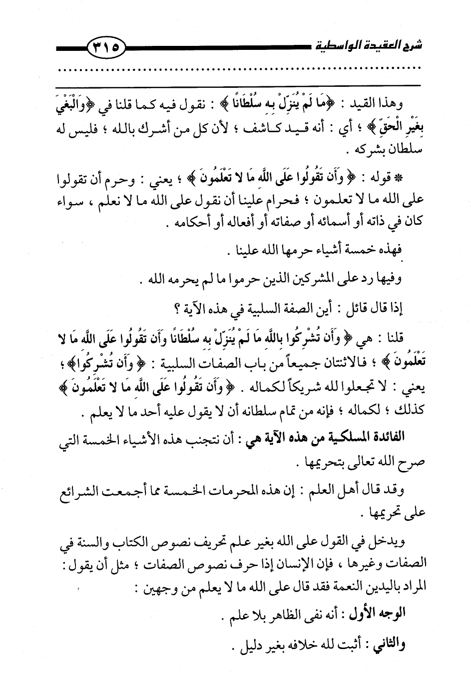 قلنا: هي {وَأَنْ تُشْرِكُوا بِاللَّهِ مَا لَمْ يُنَزِّلْ بِهِ سُلْطَانًا وَأَنْ تَقُولُوا عَلَى اللَّهِ مَا لَا تَعْلَمُونَ} ، فالاثنتان جميعا من باب الصفات السلبية: {وَأَنْ تُشْرِكُوا} ، يعني: لا تجعلوا لله شريكا لكماله. {وَأَنْ تَقُولُوا عَلَى اللَّهِ مَا لَا تَعْلَمُونَ} كذلك، لكماله، فإنه من تمام سلطانه أن لا يقول عليه أحد ما لا يعلم.