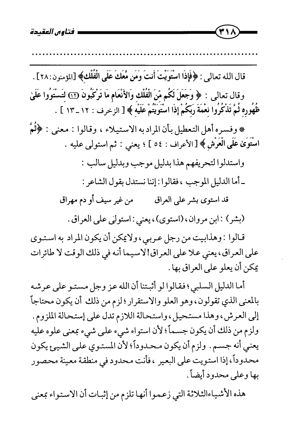قالوا: وهذا بيت من رجل عربي، ولا يمكن أن يكون المراد به استوى على العراق، يعني علا على العراق! لا سيما أنه في ذلك الوقت لا طائرات يمكن أن يعلو على العراق بها.