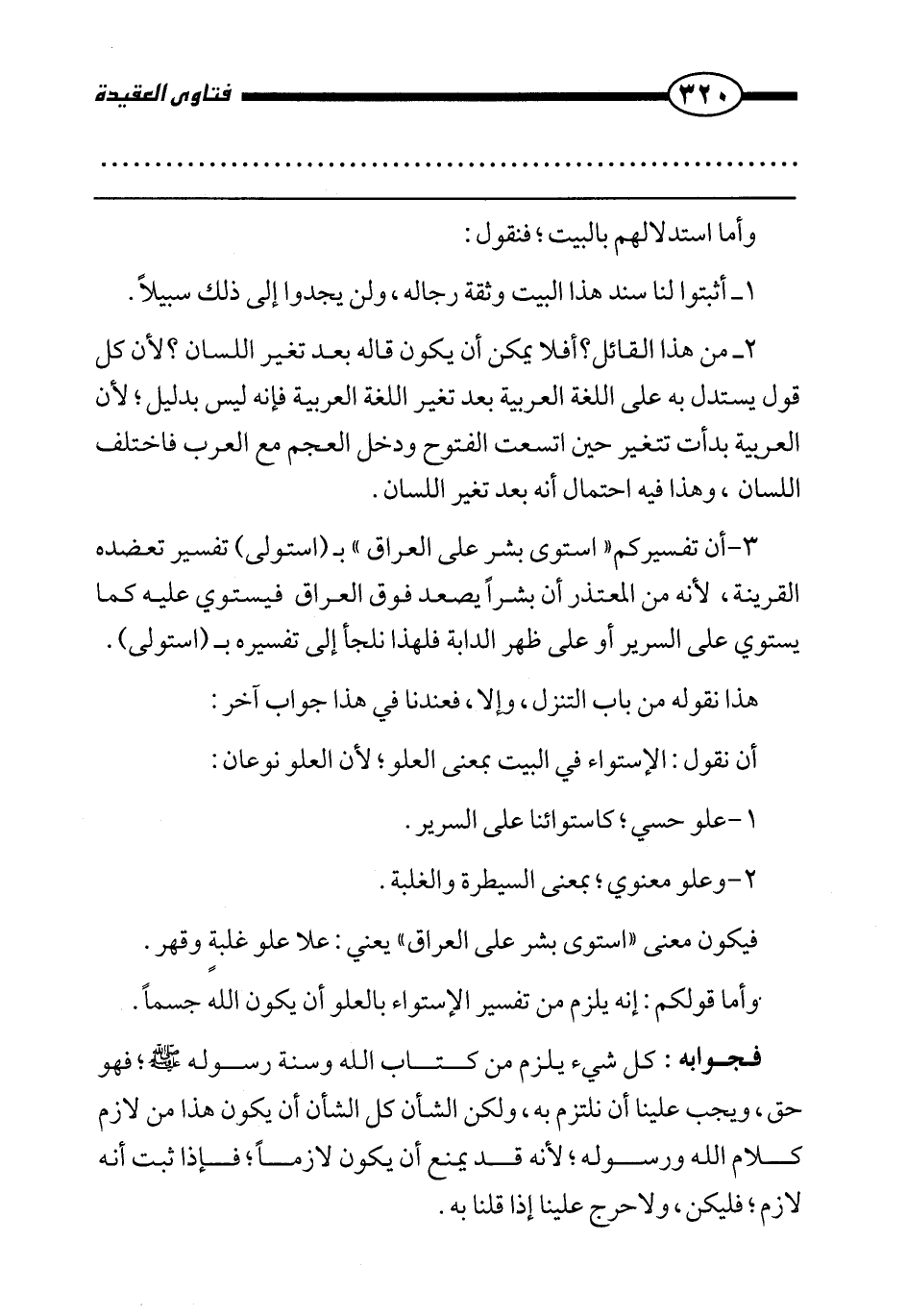 3 - أن تفسيركم "استوى بشر على العراق" بـ (استولى) تفسير تعضده القرينة؛ لأنه من المعتذر أن بشرا يصعد فوق العراق فيستوي عليه، كما يستوي على السرير أو على ظهر الدابة فلهذا نلجأ إلى تفسيره بـ (استولى) .