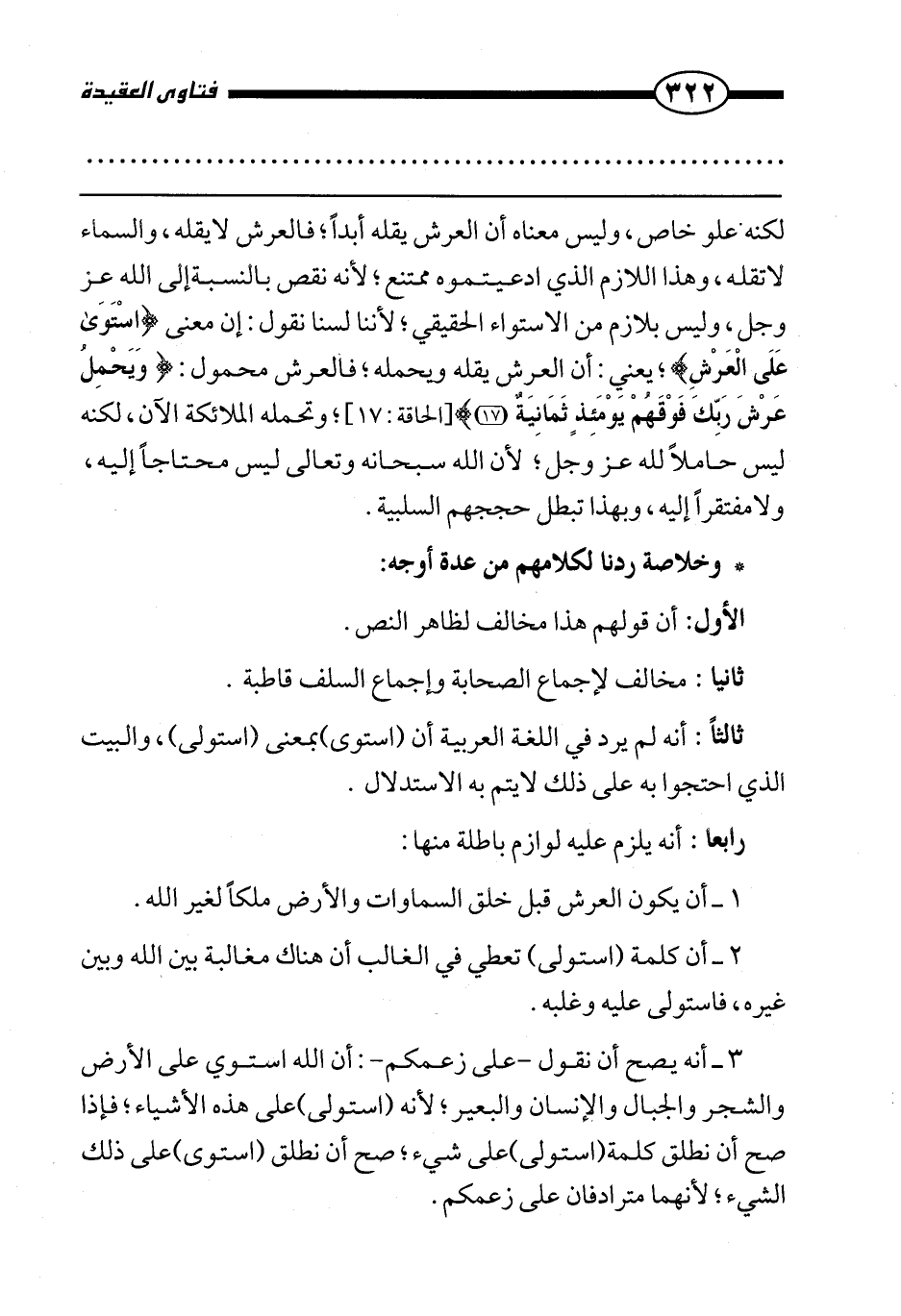 لكنه علو خالص، وليس معناه أن العرش يقله أبدا، فالعرش لا يقله، والسماء لا تقله، وهذا اللازم الذي ادعيتموه ممتنع؛ لأنه نقص بالنسبة إلى الله عز وجل، وليس بلازم من الاستواء الحقيقي؛ لأننا لسنا نقول: إن معنى {اسْتَوَى عَلَى الْعَرْشِ} ، يعني: أن العرش يقله ويحمله، فالعرش محمول: {وَيَحْمِلُ عَرْشَ رَبِّكَ فَوْقَهُمْ يَوْمَئِذٍ ثَمَانِيَةٌ} [الحاقة: 17] ، وتحمله الملائكة الآن، لكنه ليس حاملا لله عز وجل؛ لأن الله سبحانه وتعالى ليس محتاجا إليه، ولا مفتقرا إليه، وبهذا تبطل حججهم السلبية.
