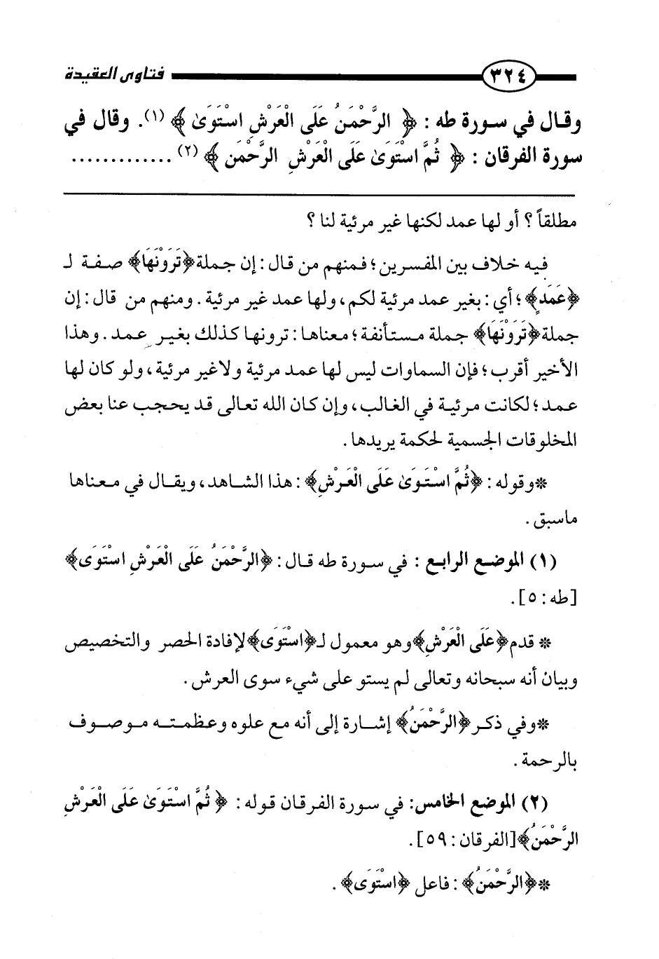 وقال في سورة طه: {الرَّحْمَنُ عَلَى الْعَرْشِ اسْتَوَى} وقال في سورة الفرقان: {ثُمَّ اسْتَوَى عَلَى الْعَرْشِ الرَّحْمَنُ}