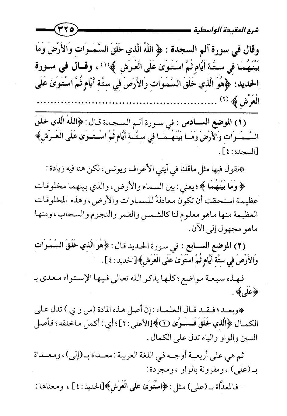 وقال في سورة آلم السجدة: {اللَّهُ الَّذِي خَلَقَ السَّمَاوَاتِ وَالْأَرْضَ وَمَا بَيْنَهُمَا فِي سِتَّةِ أَيَّامٍ ثُمَّ اسْتَوَى عَلَى الْعَرْشِ} وقال في سورة الحديد: {هُوَ الَّذِي خَلَقَ السَّمَاوَاتِ وَالْأَرْضَ فِي سِتَّةِ أَيَّامٍ ثُمَّ اسْتَوَى عَلَى الْعَرْشِ} .
